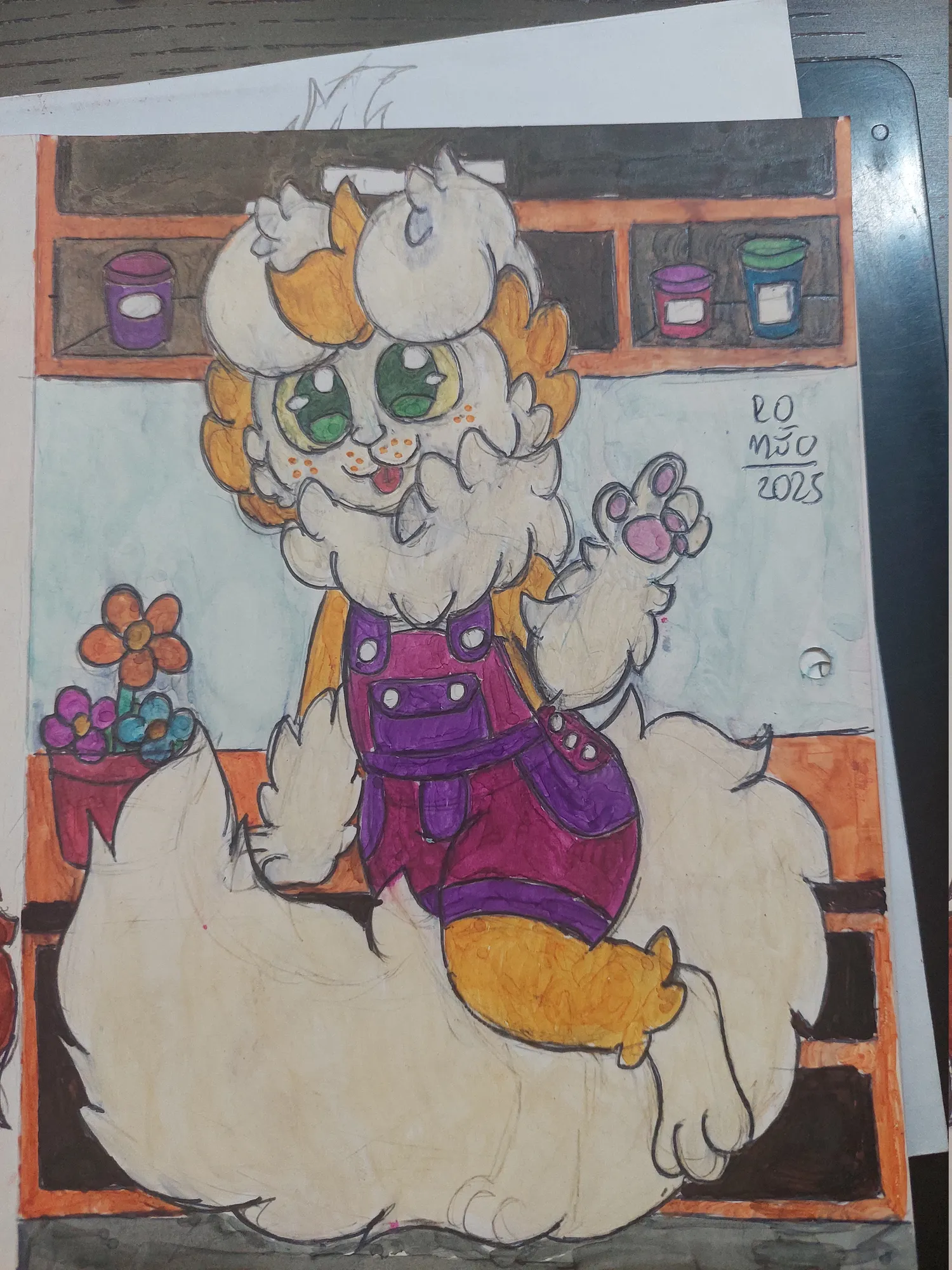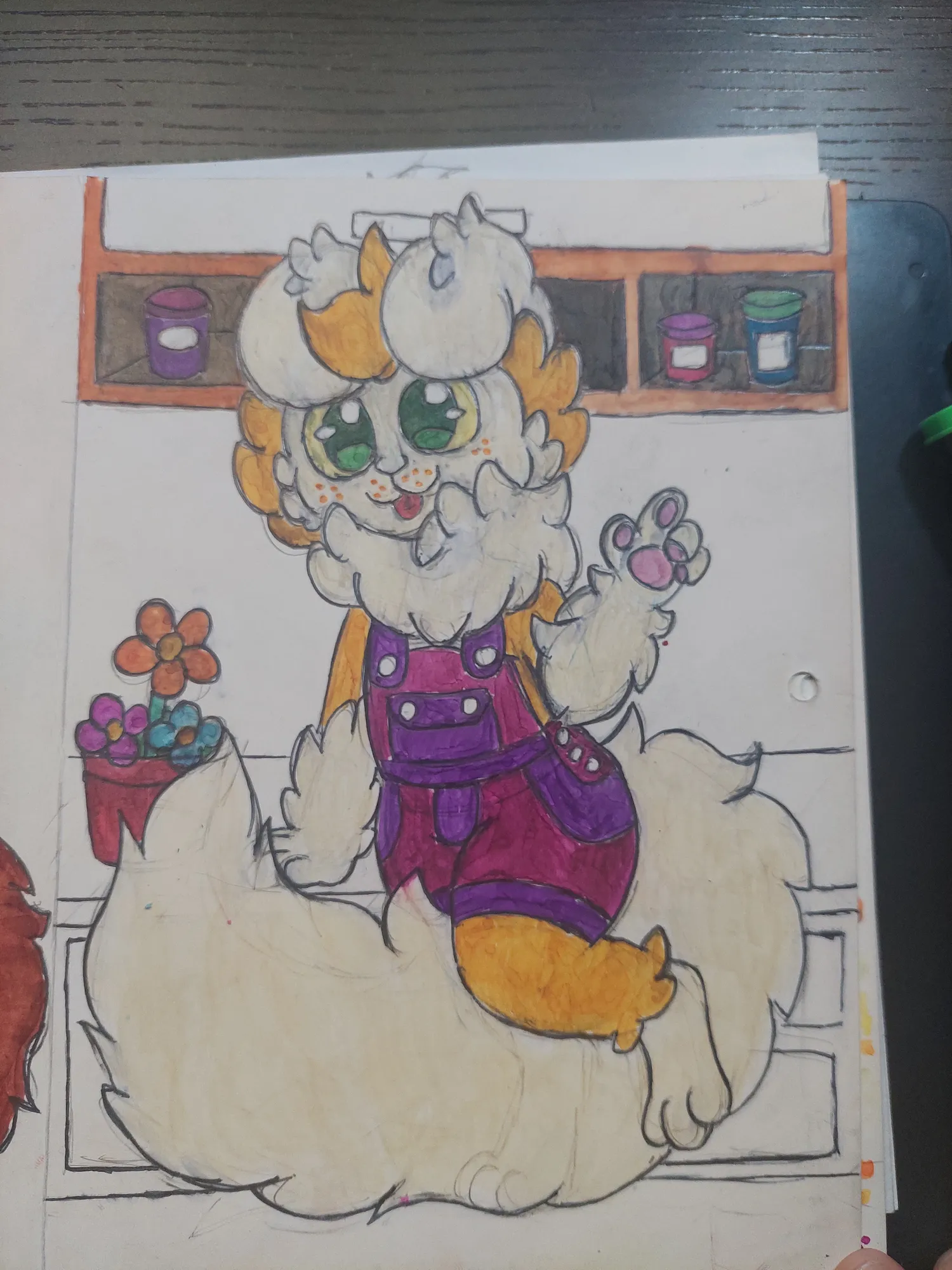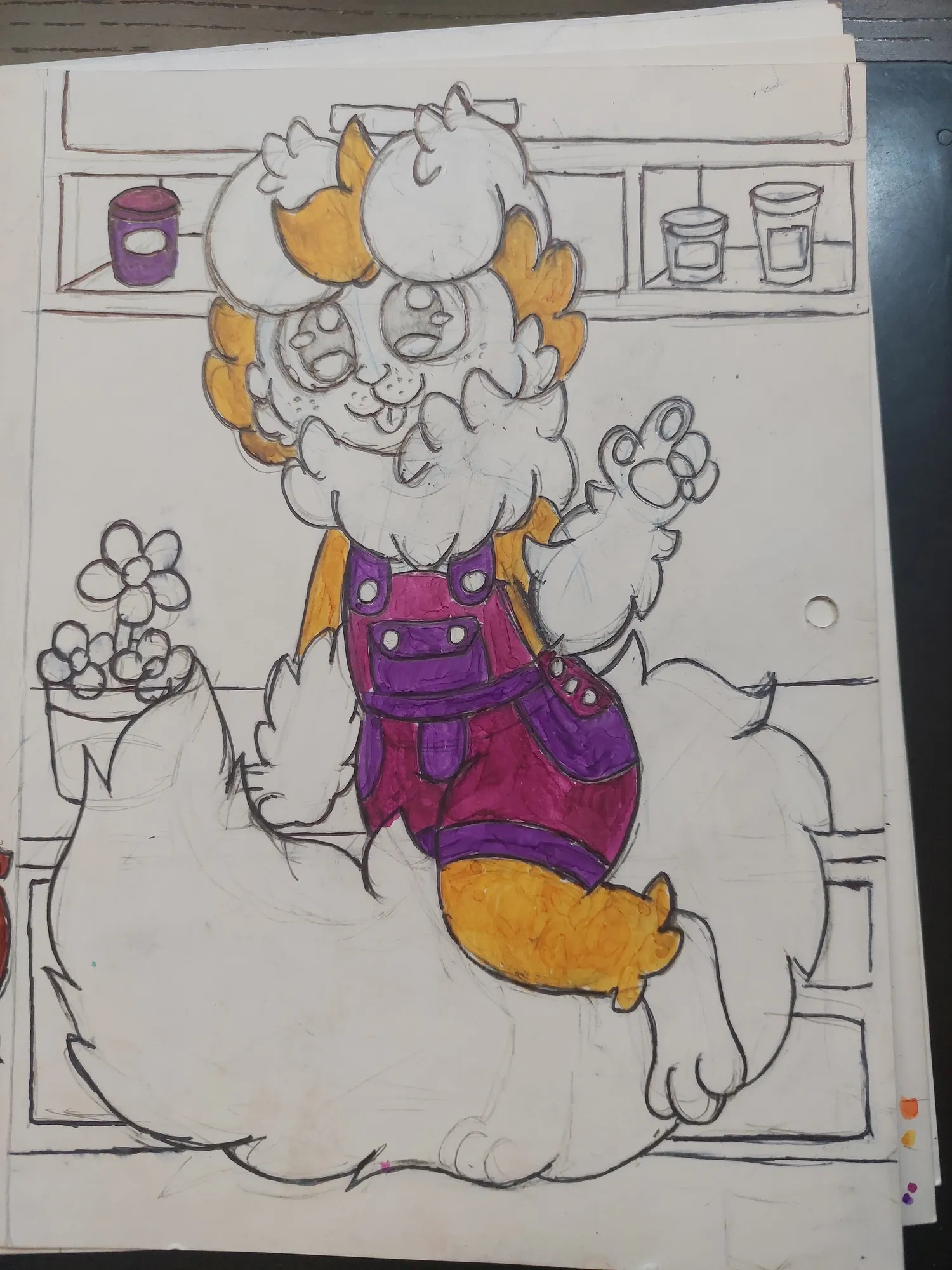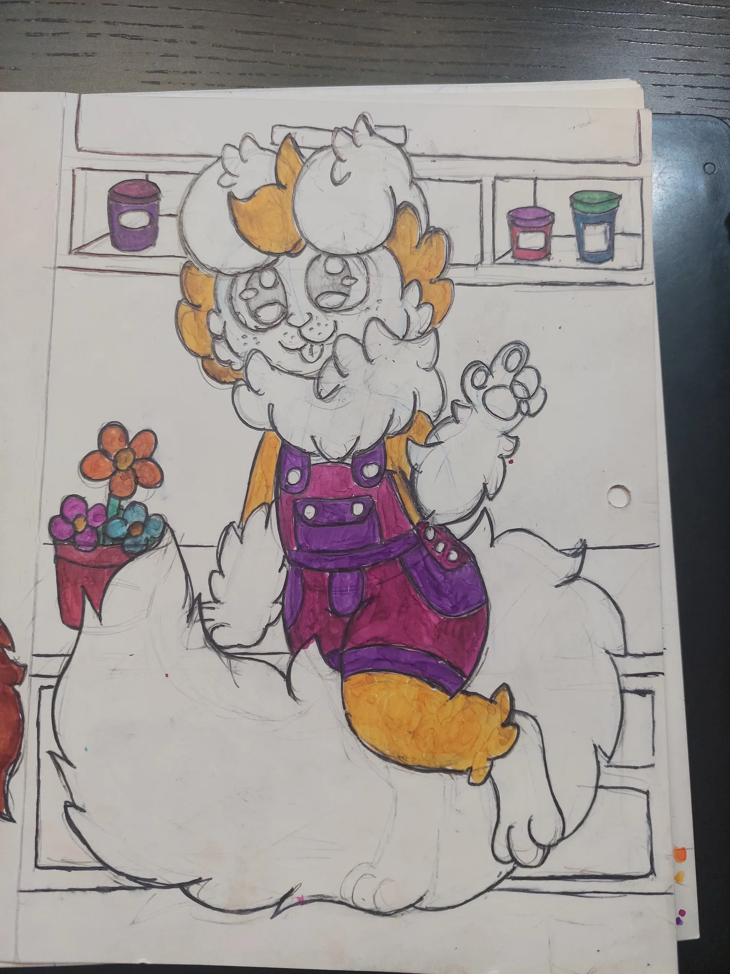 E fui prosseguindo mais no desenho, onde pintei o Romeo e fui pintando o cenário. Primeiro os potes no armário, depois as flores…