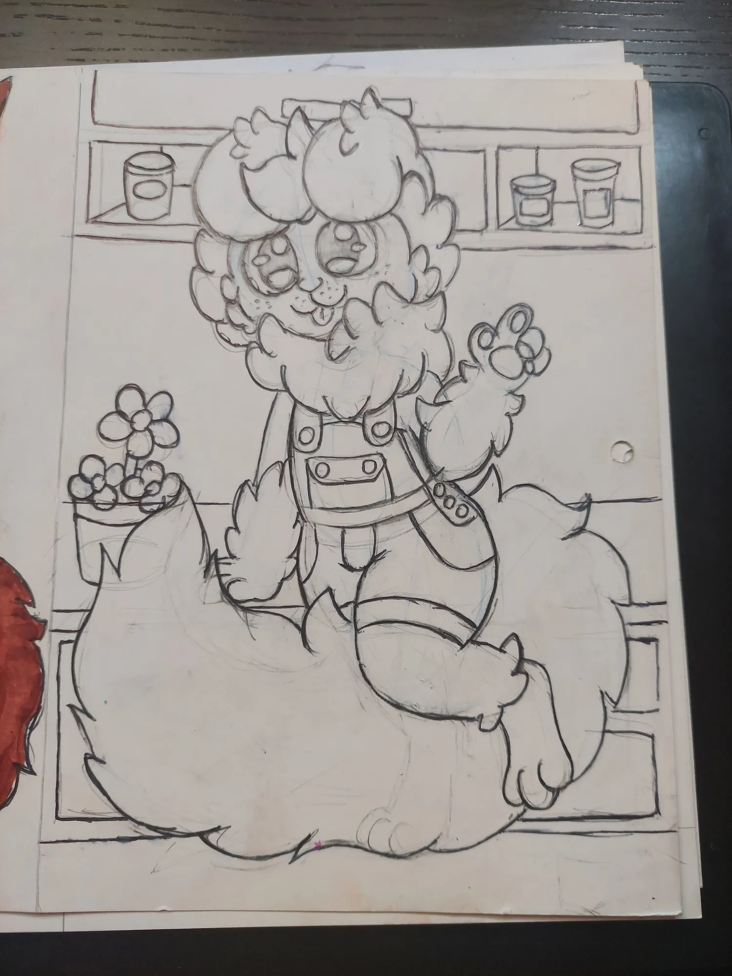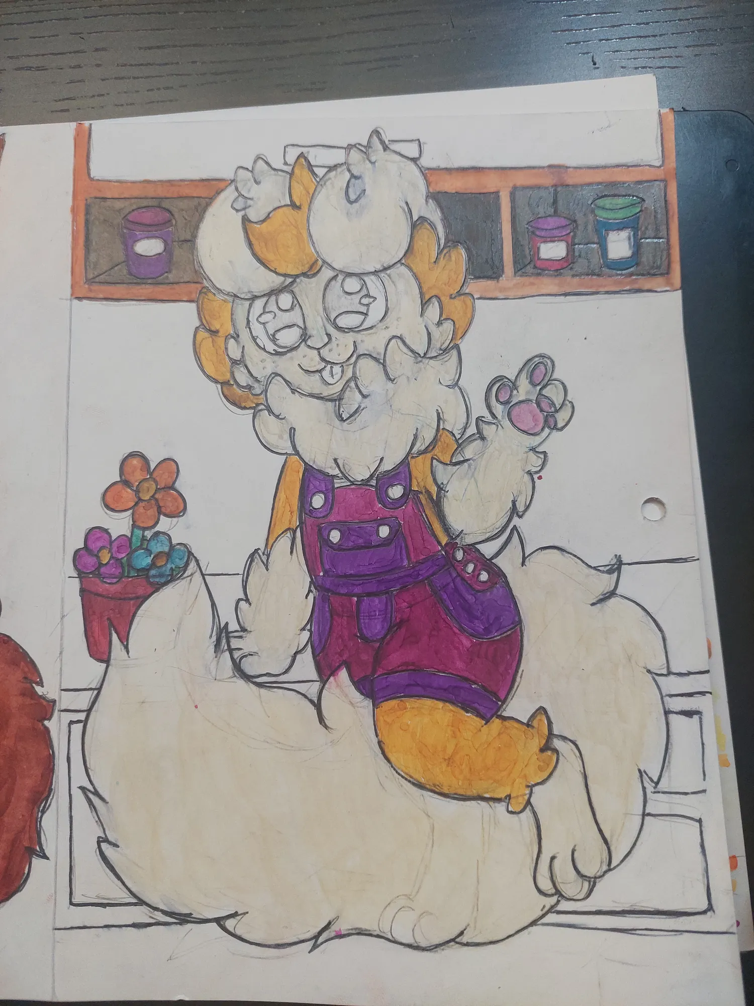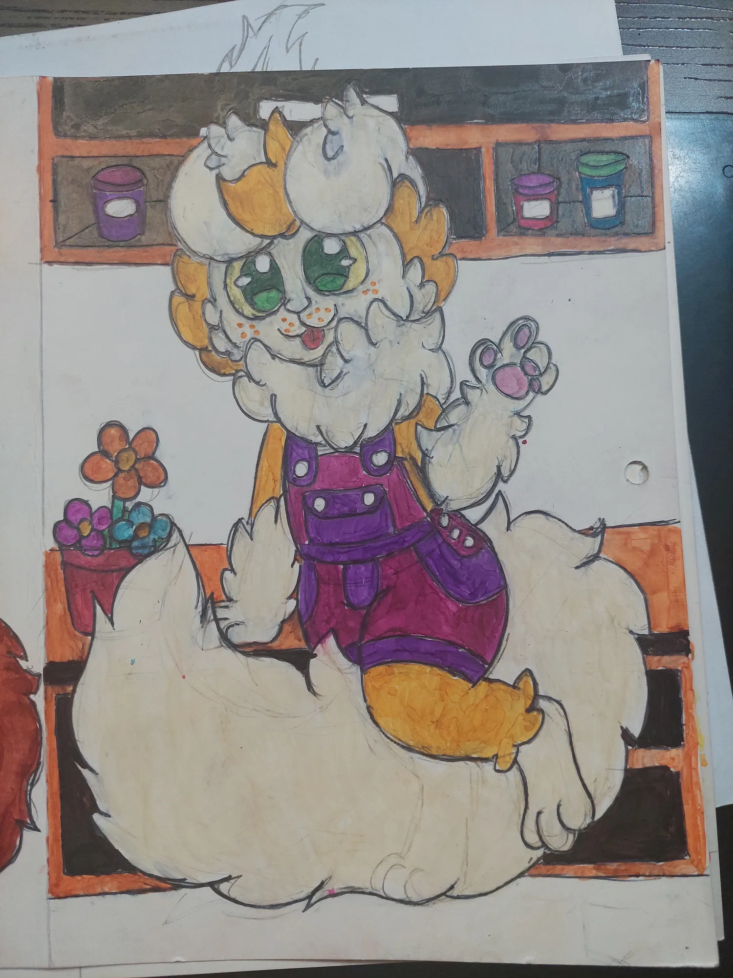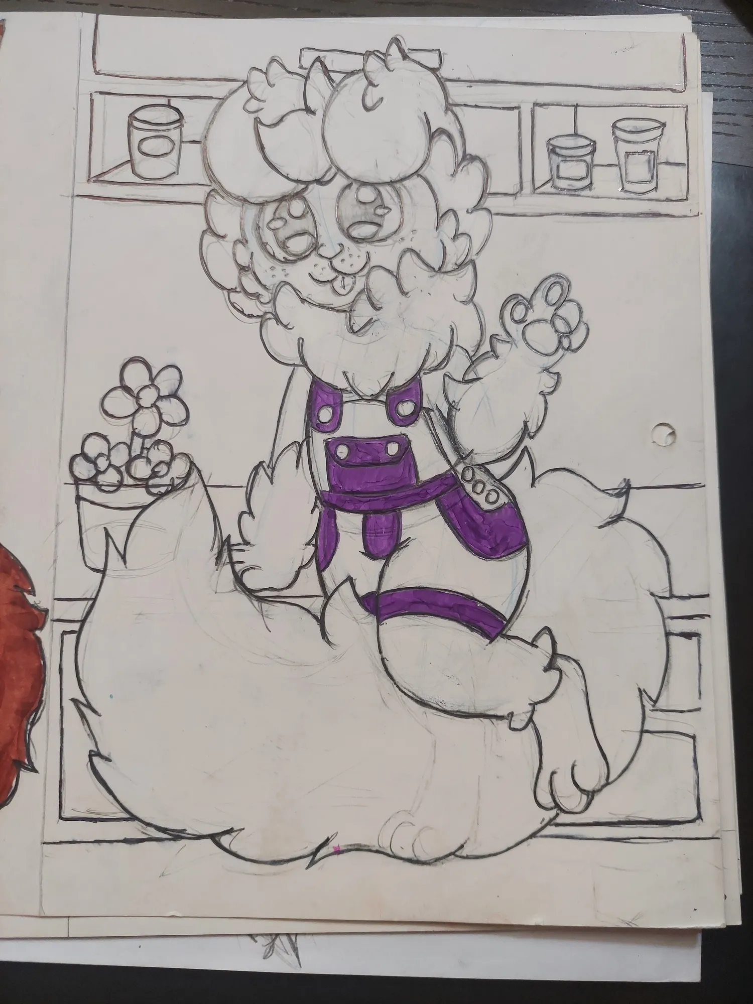 E fui prosseguindo mais no desenho, onde pintei o Romeo e fui pintando o cenário. Primeiro os potes no armário, depois as flores…