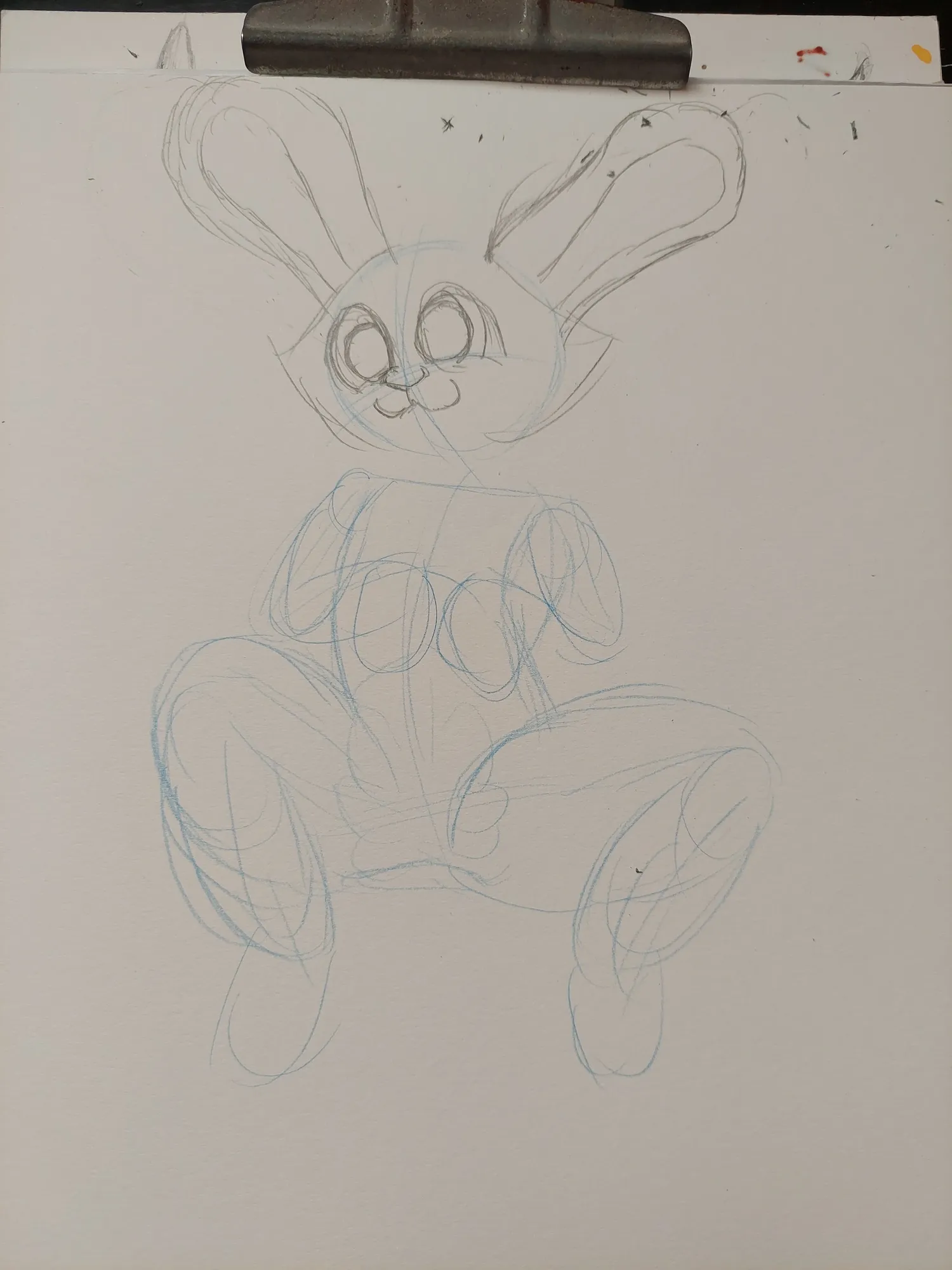 Assim, comecei a fazer o esboço, fazendo o tronco, coxas, patas e as orelhas. E se o Romeo tem as orelhas dobradas quando ele está em pé, por que não elas ficarem estendidas quando ele deita em algum lugar? E foi exatamente isso que fiz.