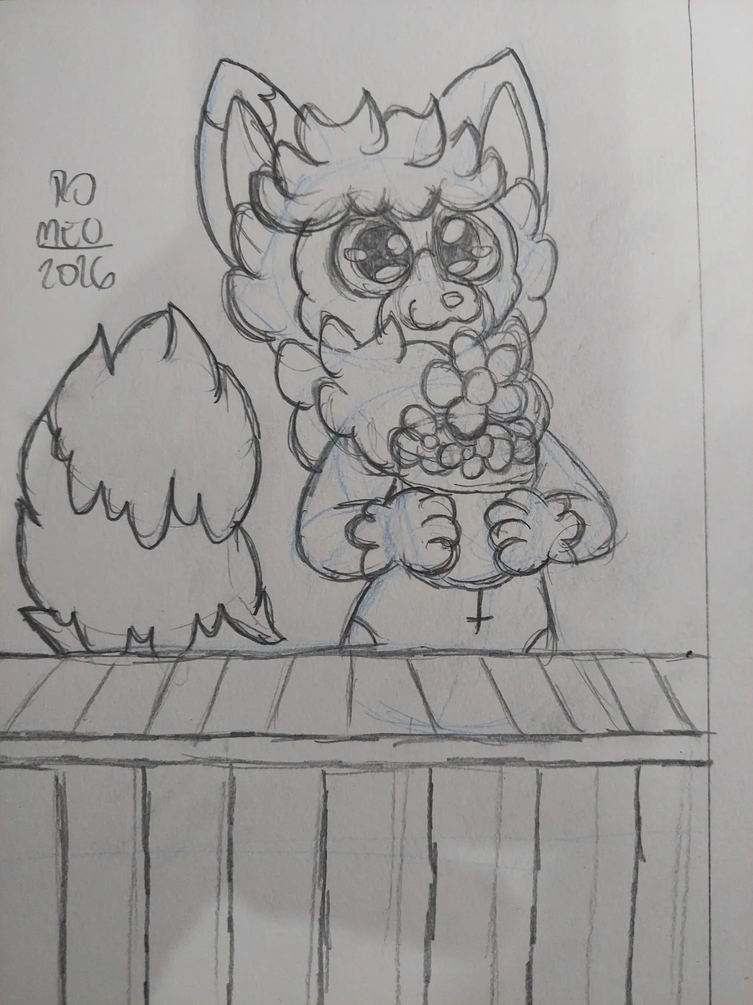 E depois, avancei bastante nesse desenho. Fiz o colar de pelos, cauda, os dedos das patas e as marcas do corpo. Claro, fiz as flores que ficaram simples, mas que gostei bastante. E por fim, pintei as pupilas dos olhos e fiz a bancada que o Ygo estaria.