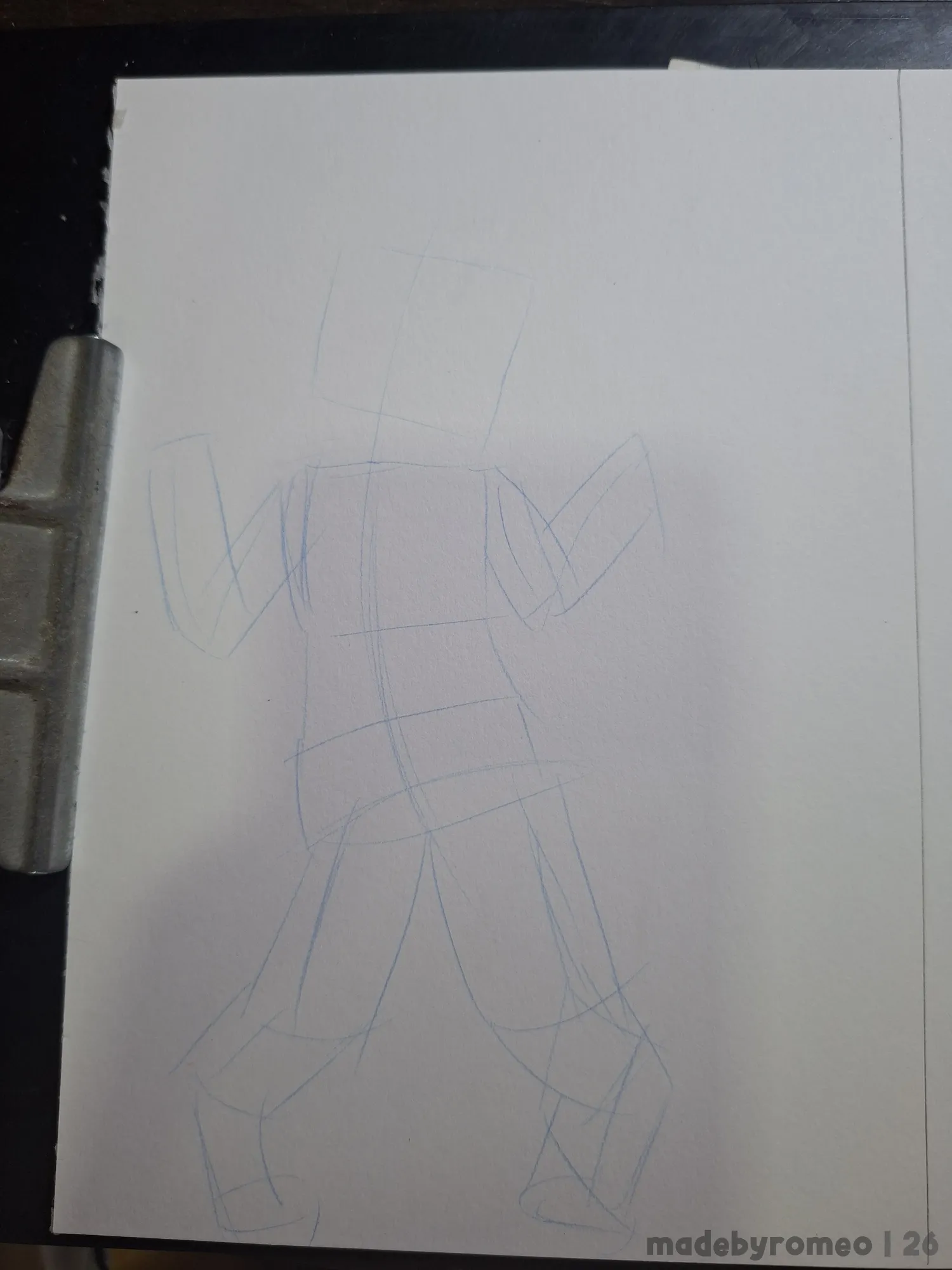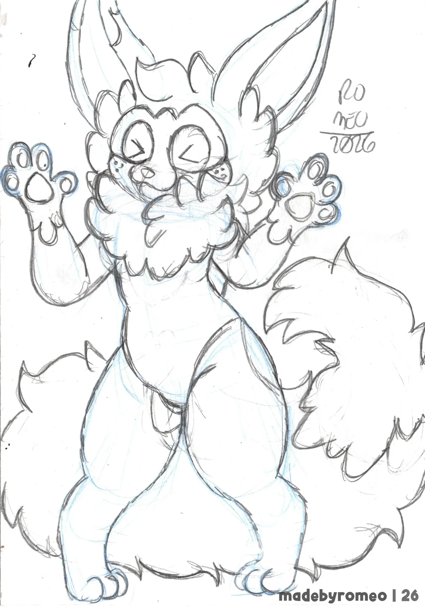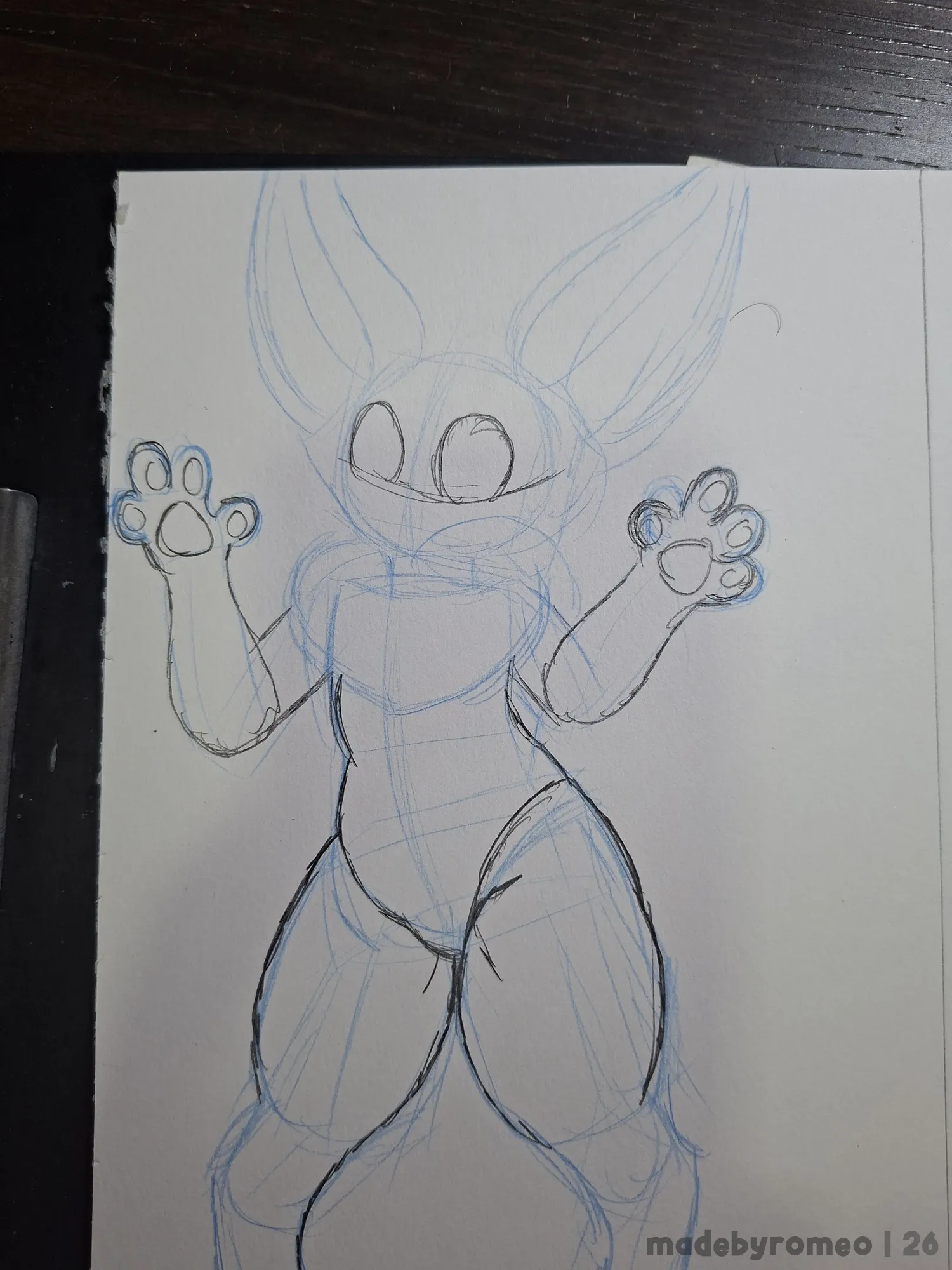 Comecei o desenho como sempre: Com as primeiras formas da pose. Com isso, fui modelar o corpo do Cannellla, fazendo o maiô, coxas, patas e olhos, além do esboço das orelhas dele. Eu estava gostando bastante de como o desenho estava ficando.