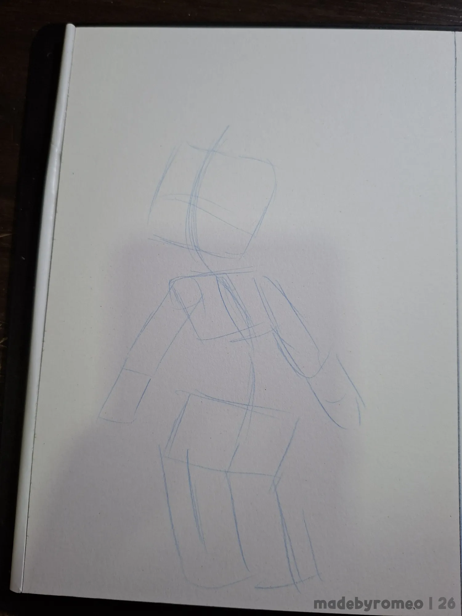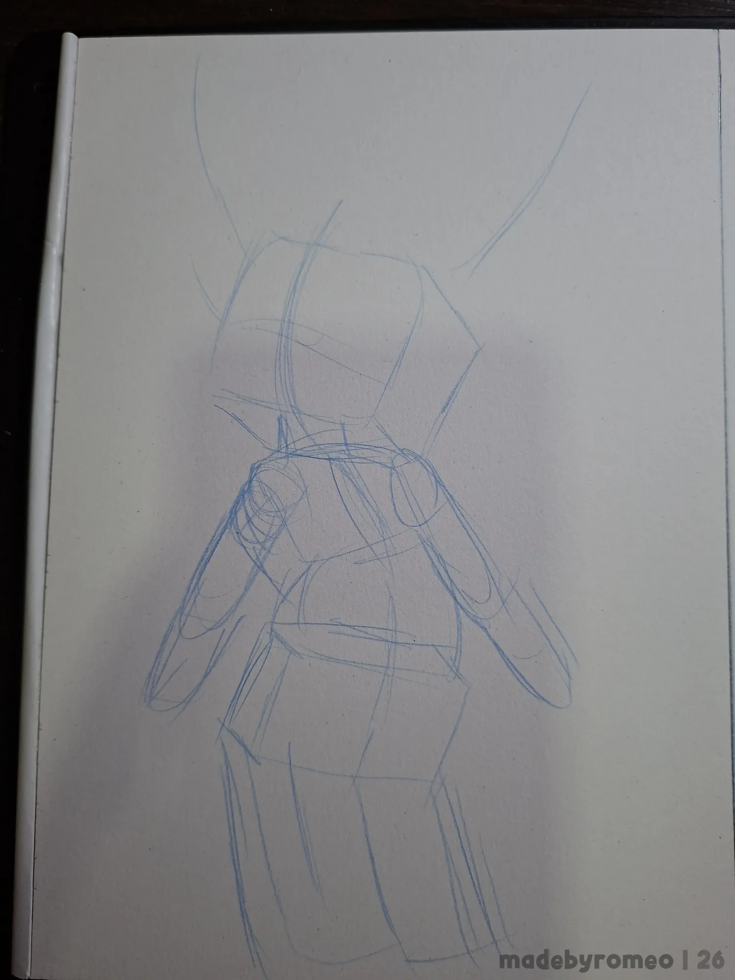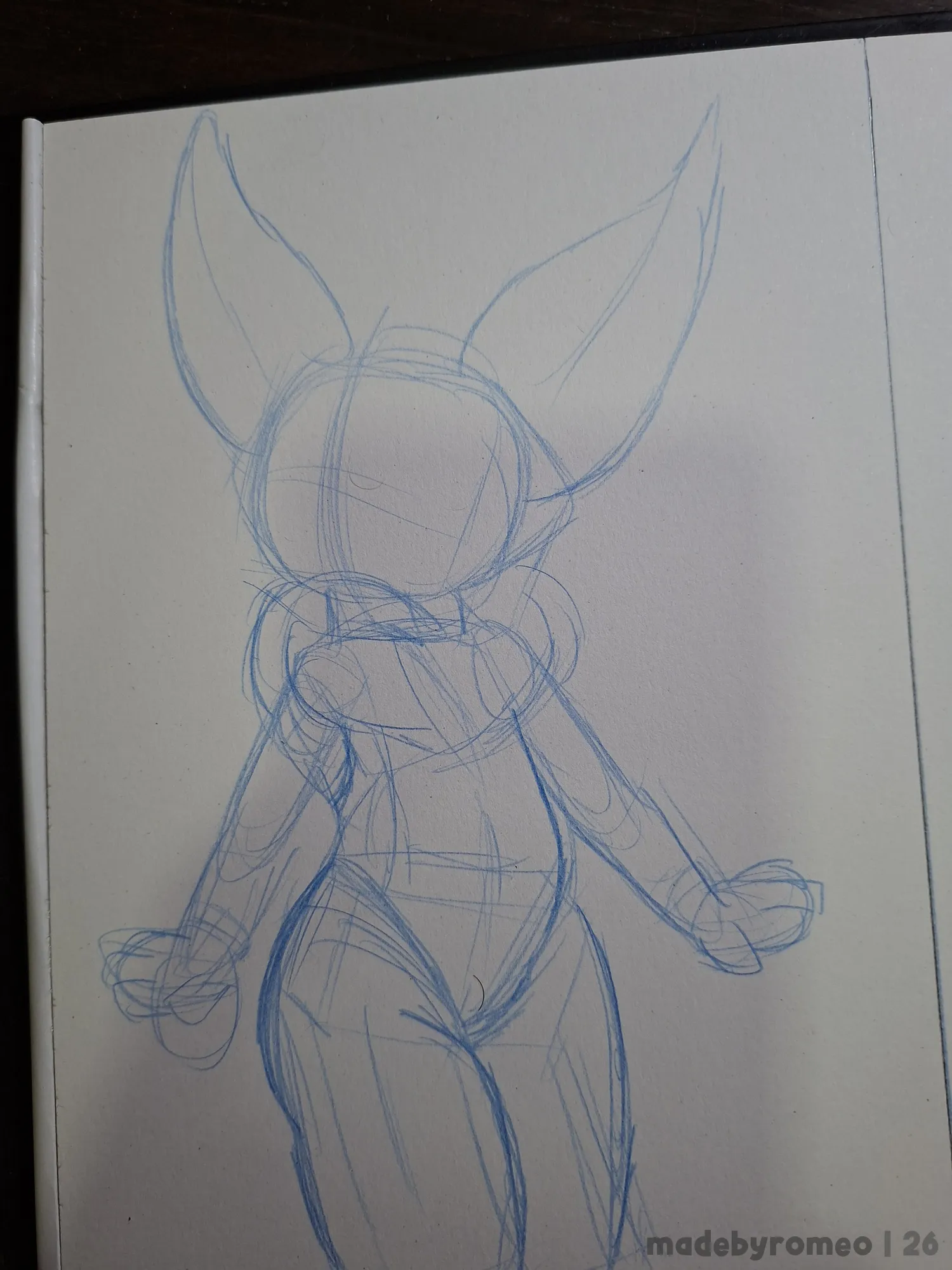 Comecei o desenho como sempre: Com as primeiras formas da pose, sendo ela com o Cannella olhando para um lado enquanto o corpo está levemente virado para o outro. Uma pose bem comum. Depois, dei mais volume às formas. Eu achei estranhas, mas decidi confiar no processo.