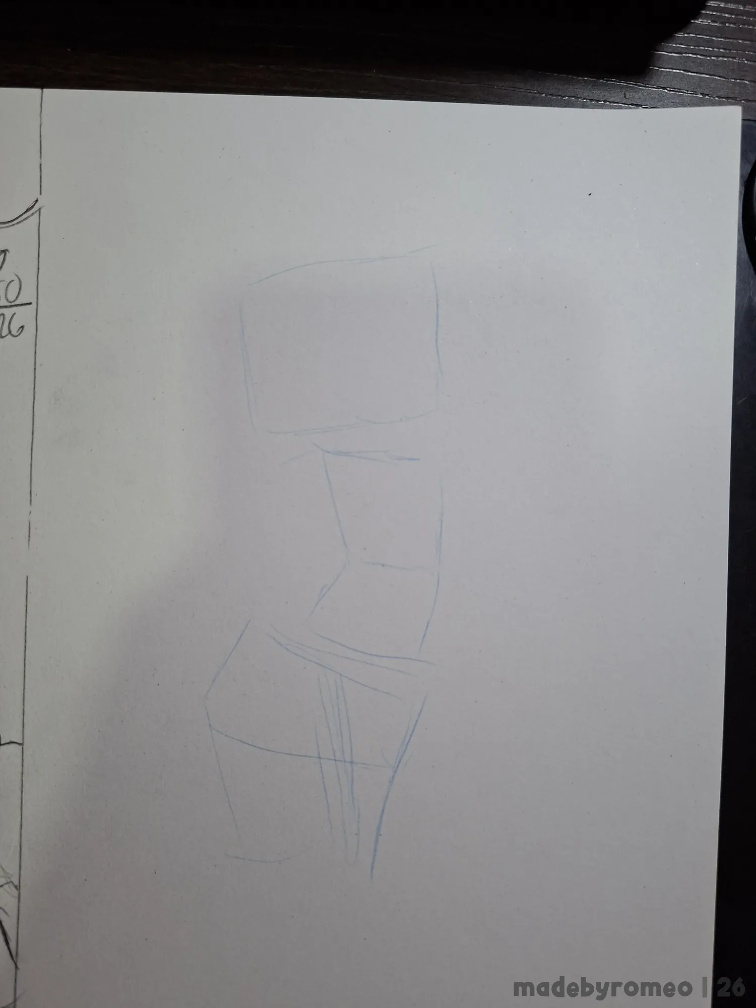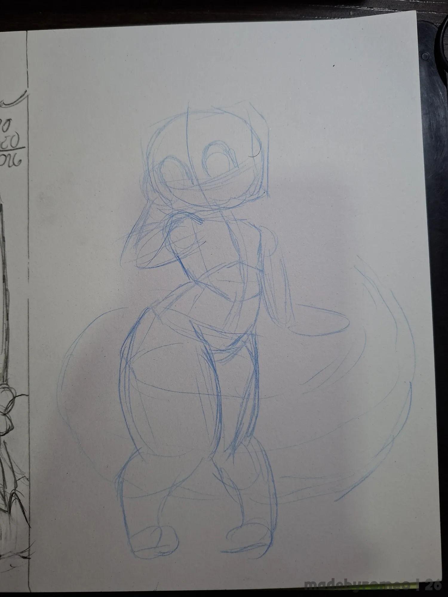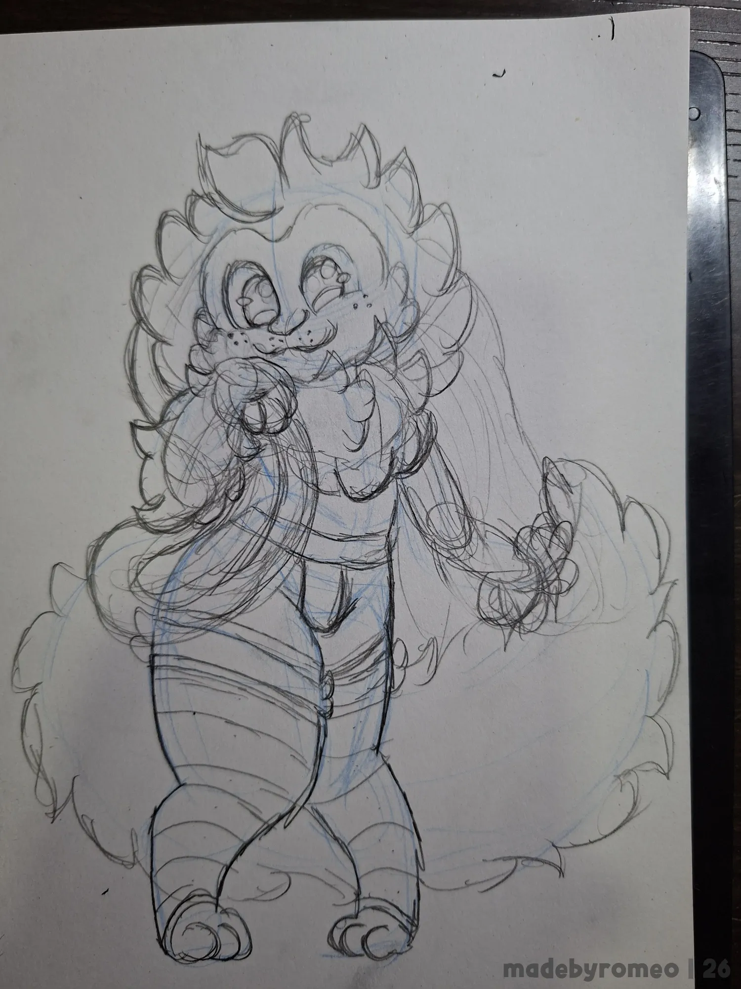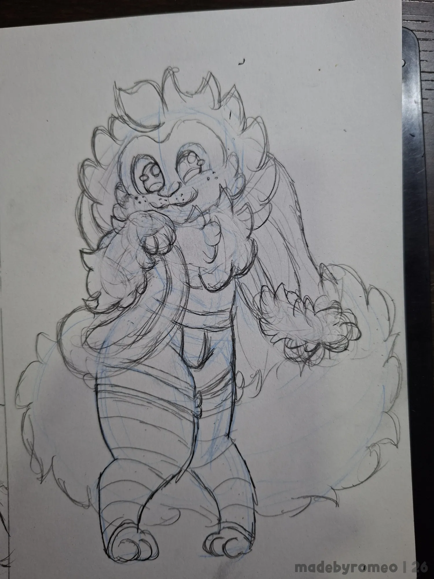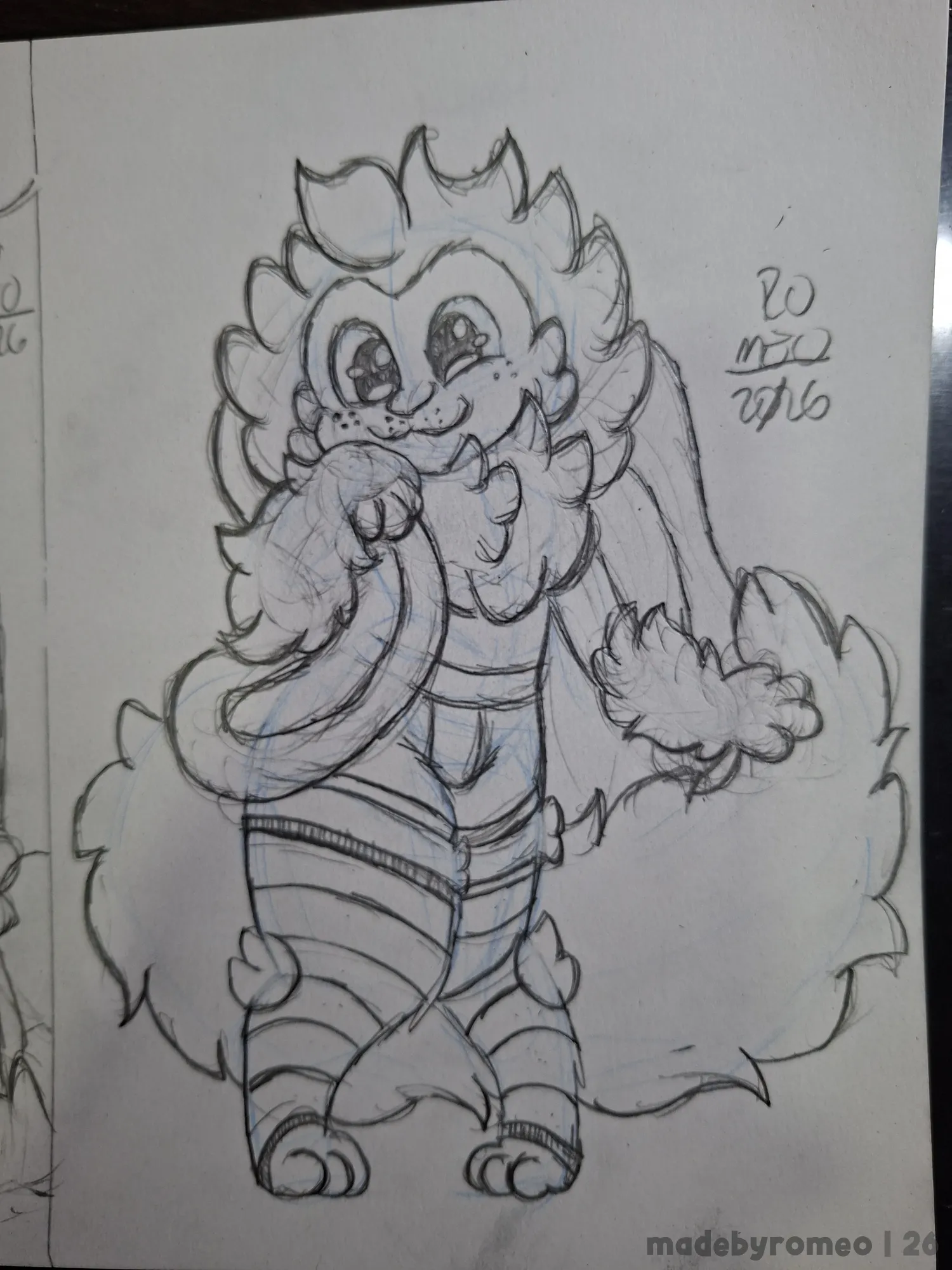 Depois, avancei mais no desenho, onde decidi fazer o Romeo e com isso, fiz o esboço dos olhos e da cauda dele, e depois comecei a dar forma ao Romeo. Eu queria fazer um macacão, mas acabei fazendo o Romeo com um shortinho. E achei isso adorável.