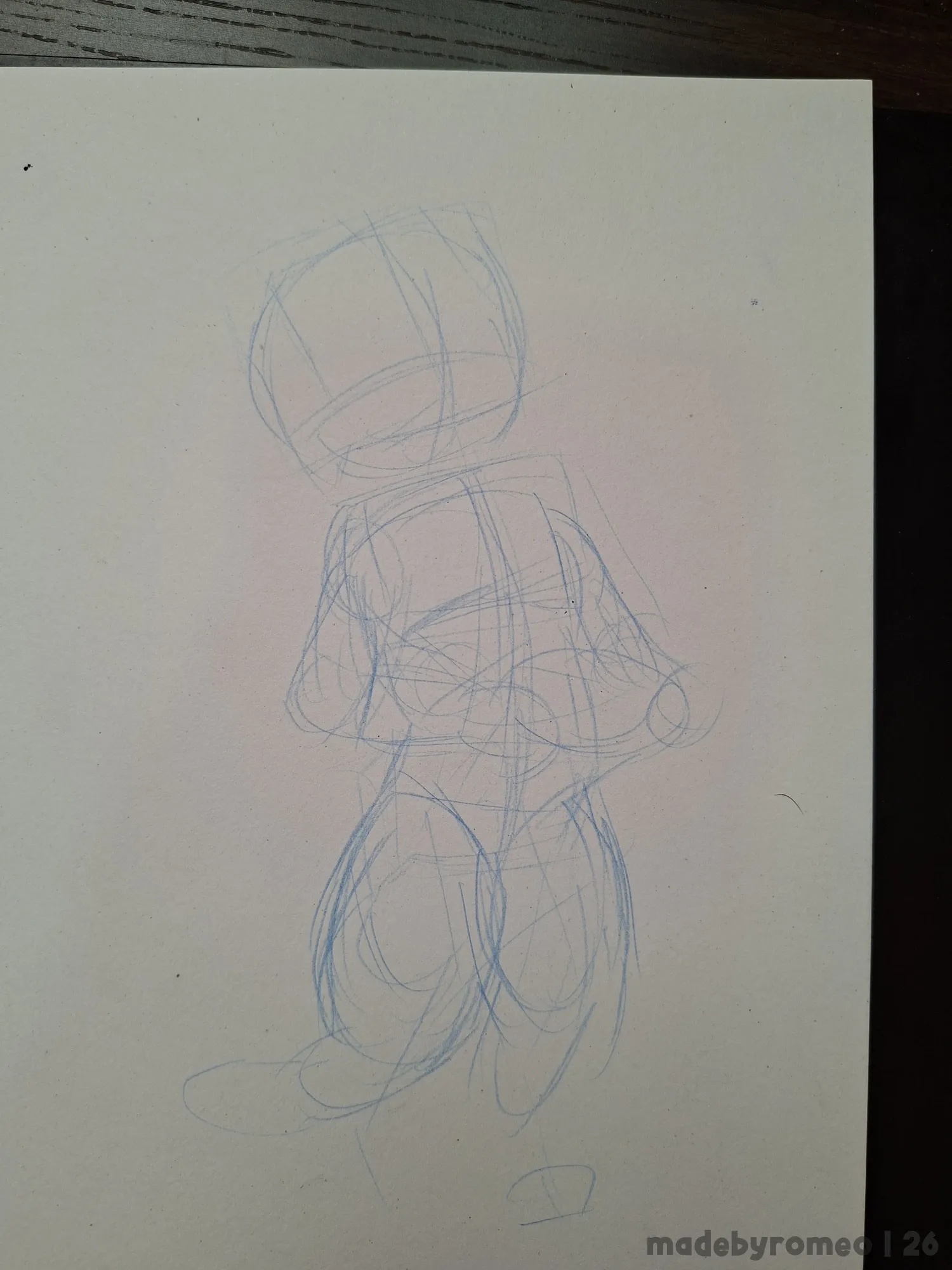 … mas resolvi me arriscar. Com o próprio grafite azul, eu me arrisquei a fazer uma pose com mais movimento, o que inicialmente não gostei, mas que decidi prosseguir, e logo ao trocar para o grafite normal e prosseguir com o esboço, comecei a gostar do que estava vendo.