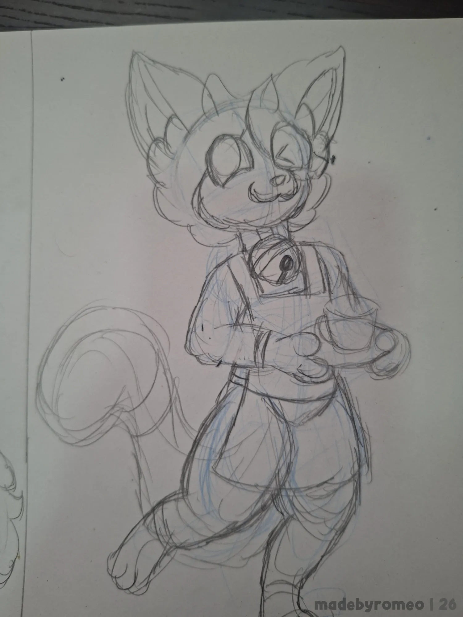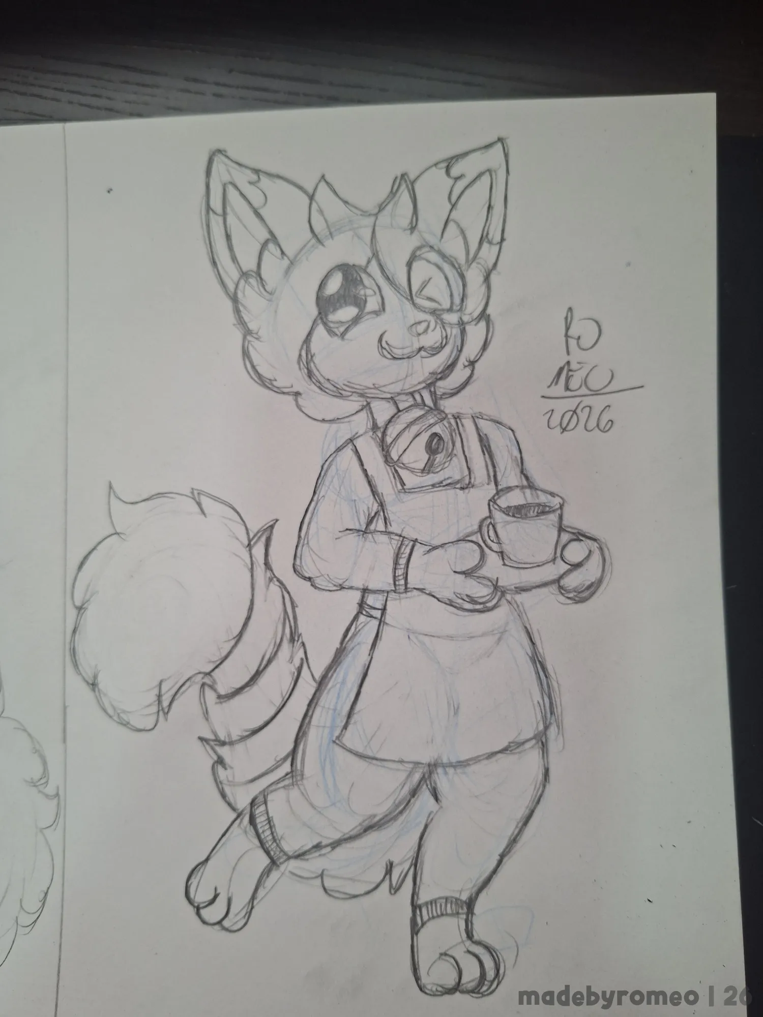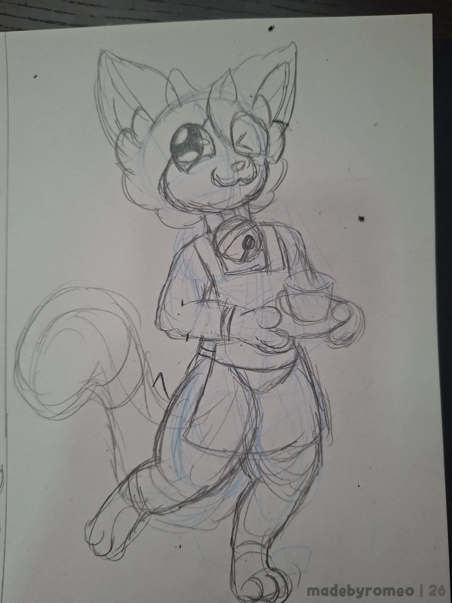 Assim, comecei a fazer a roupa de barista, o colar com o guizo, as patas segurando a bandeja e as coxas. Depois, comecei a fazer a cabeça e a cauda do Mocha. Nesse ponto, o desenho já estava ficando bom.
