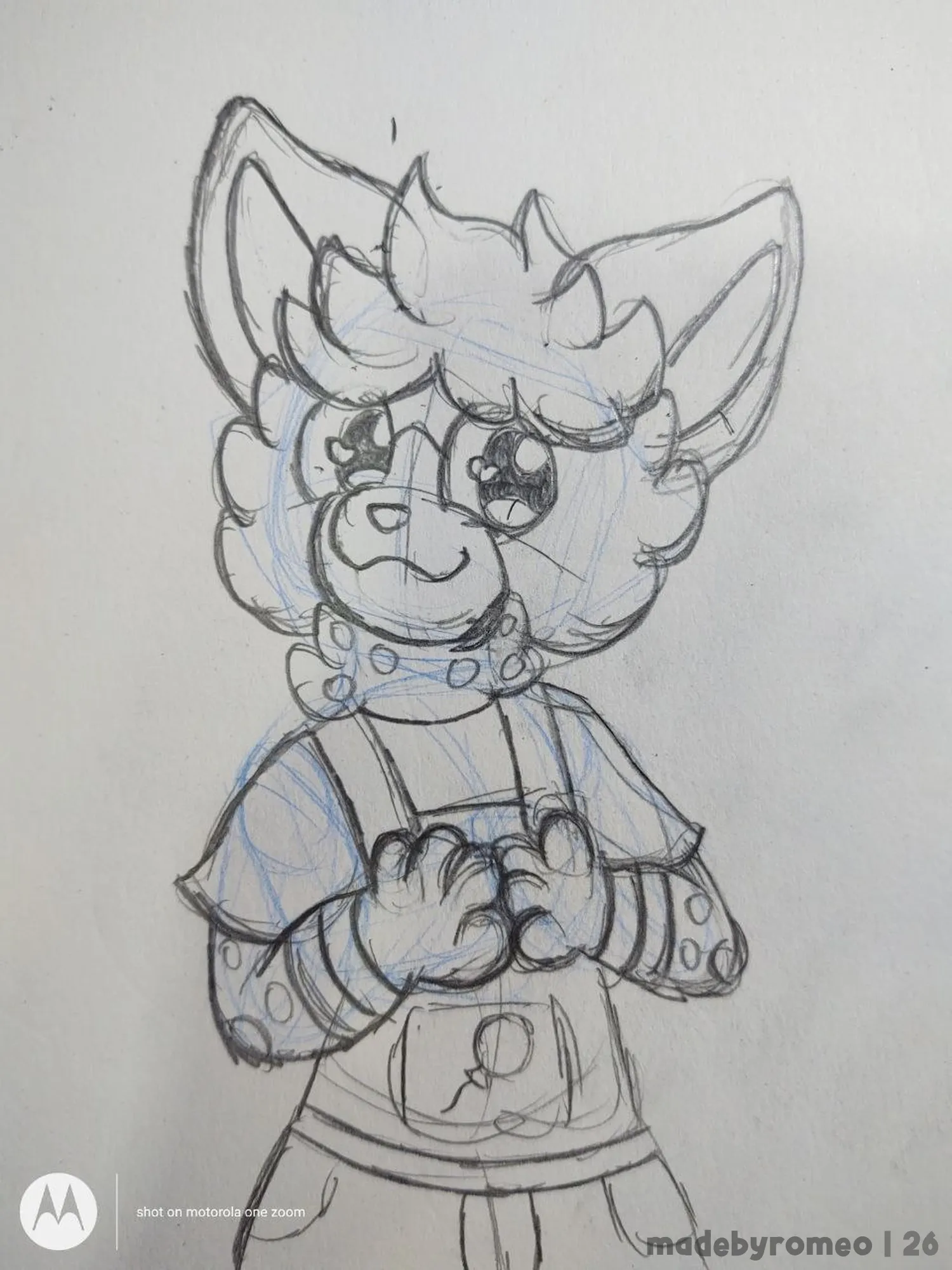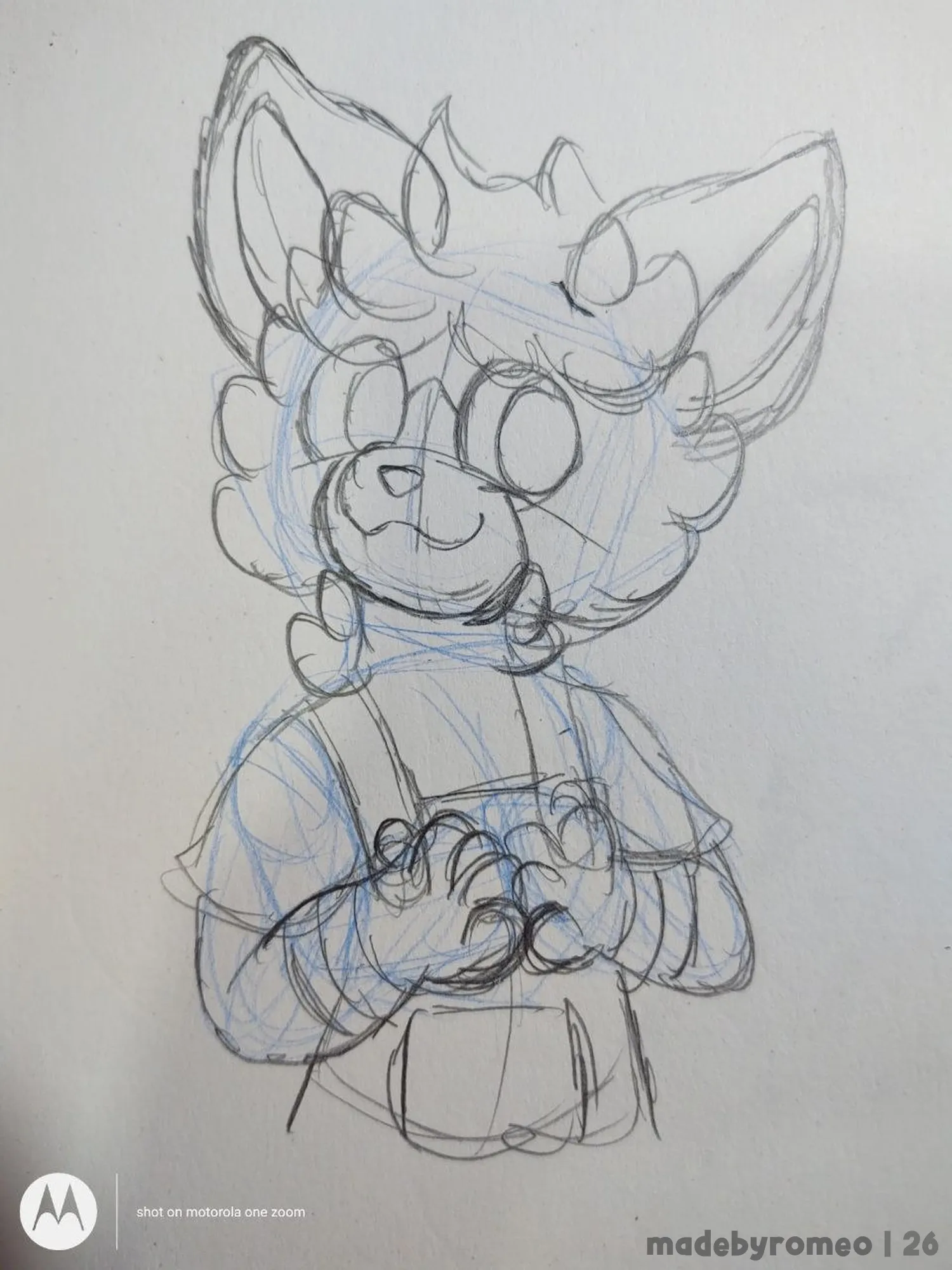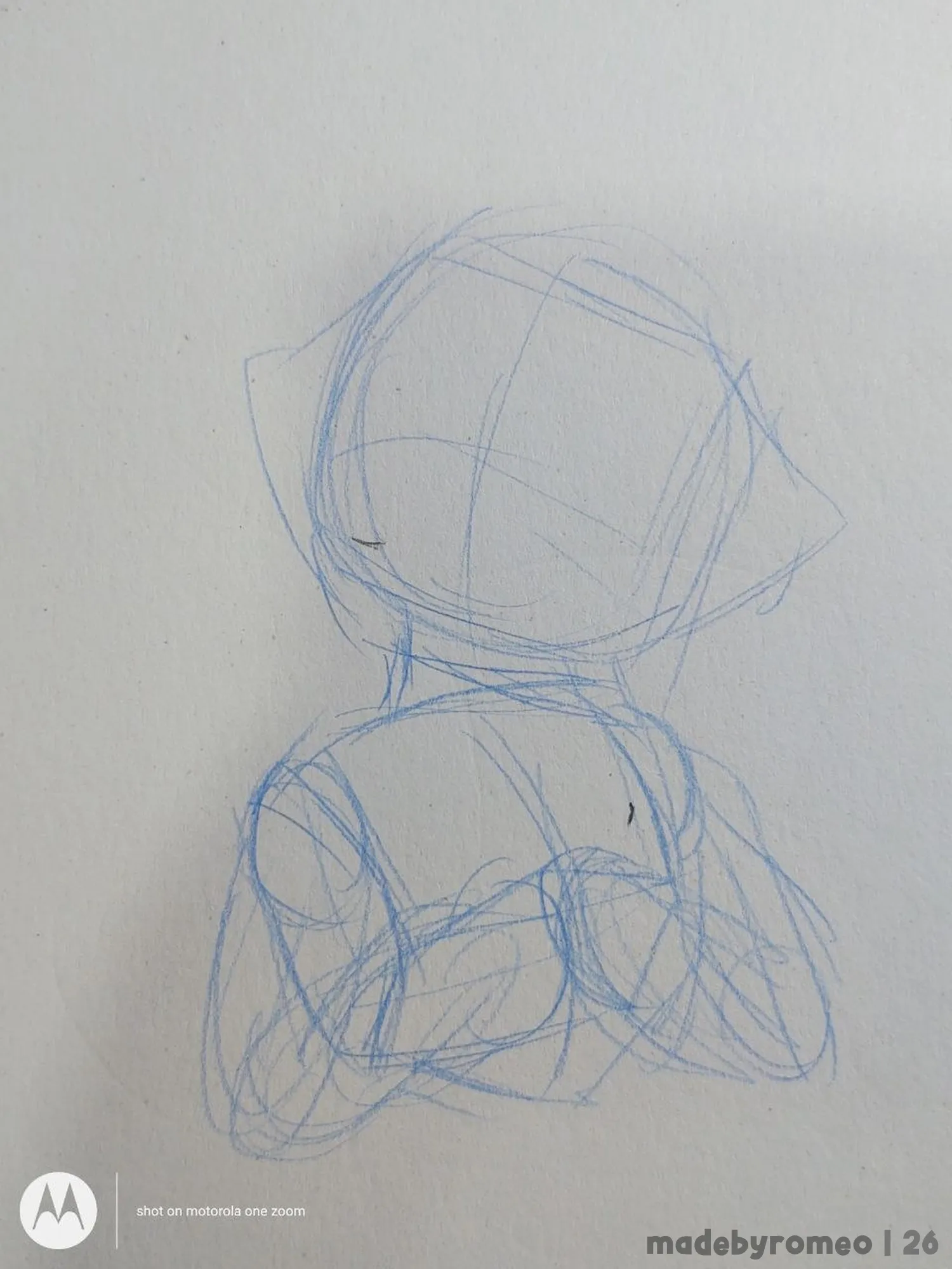 Comecei o desenho como sempre: Com as primeiras formas da cabeça e do tronco. Depois, comecei a fazer os braços e o peito dele. Gostei bastante de como havia ficado…
