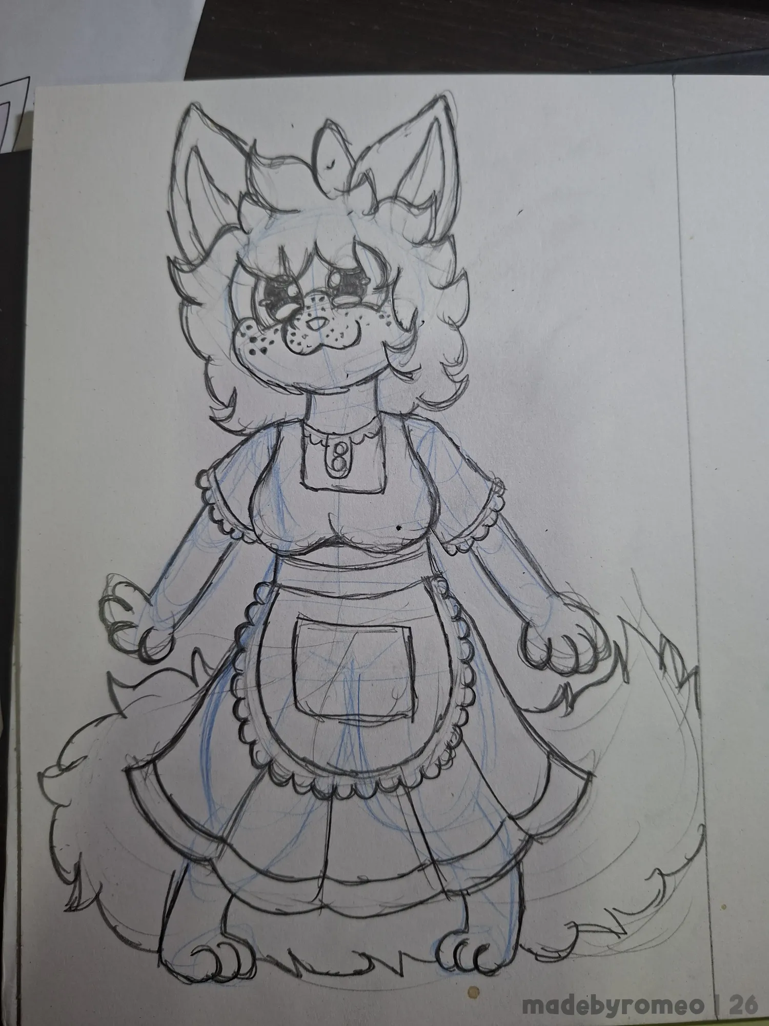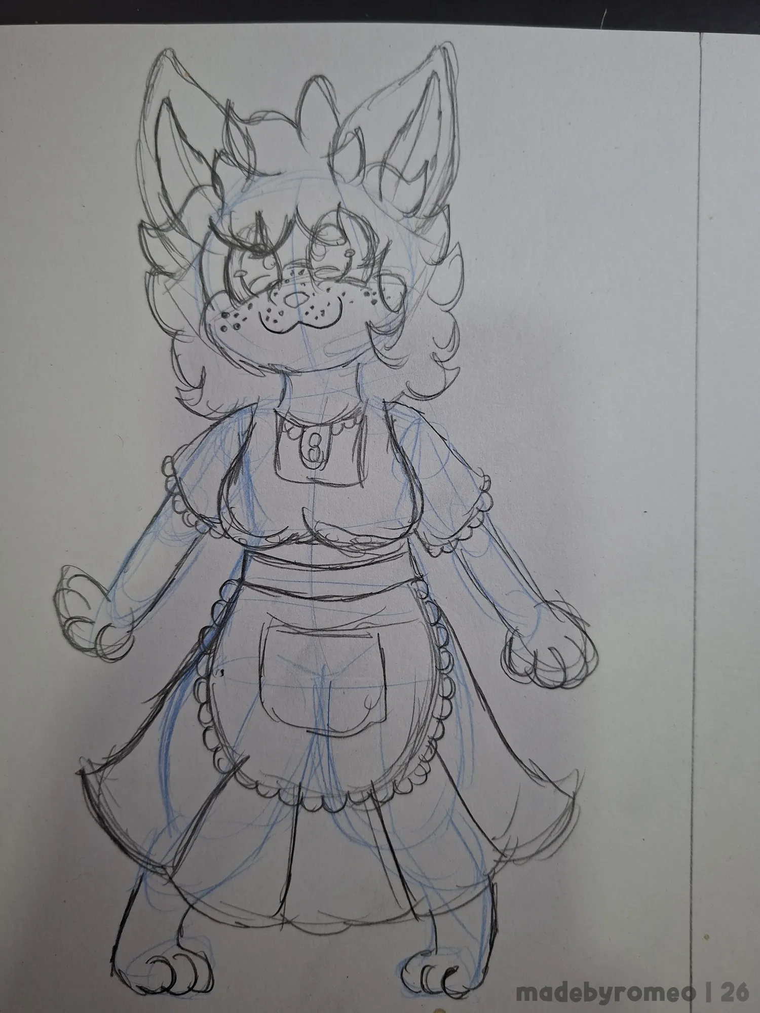 Depois, comecei a dar forma à Ruby: Fiz o cabelo, orelhas, olhos, patas e seios e comecei a fazer a roupa dela. Com isso, fui avançando no desenho, fazendo os detalhes do vestido e finalizando-o, detalhando os olhos e fazendo as sardas. Aqui, eu já estava adorando o desenho.