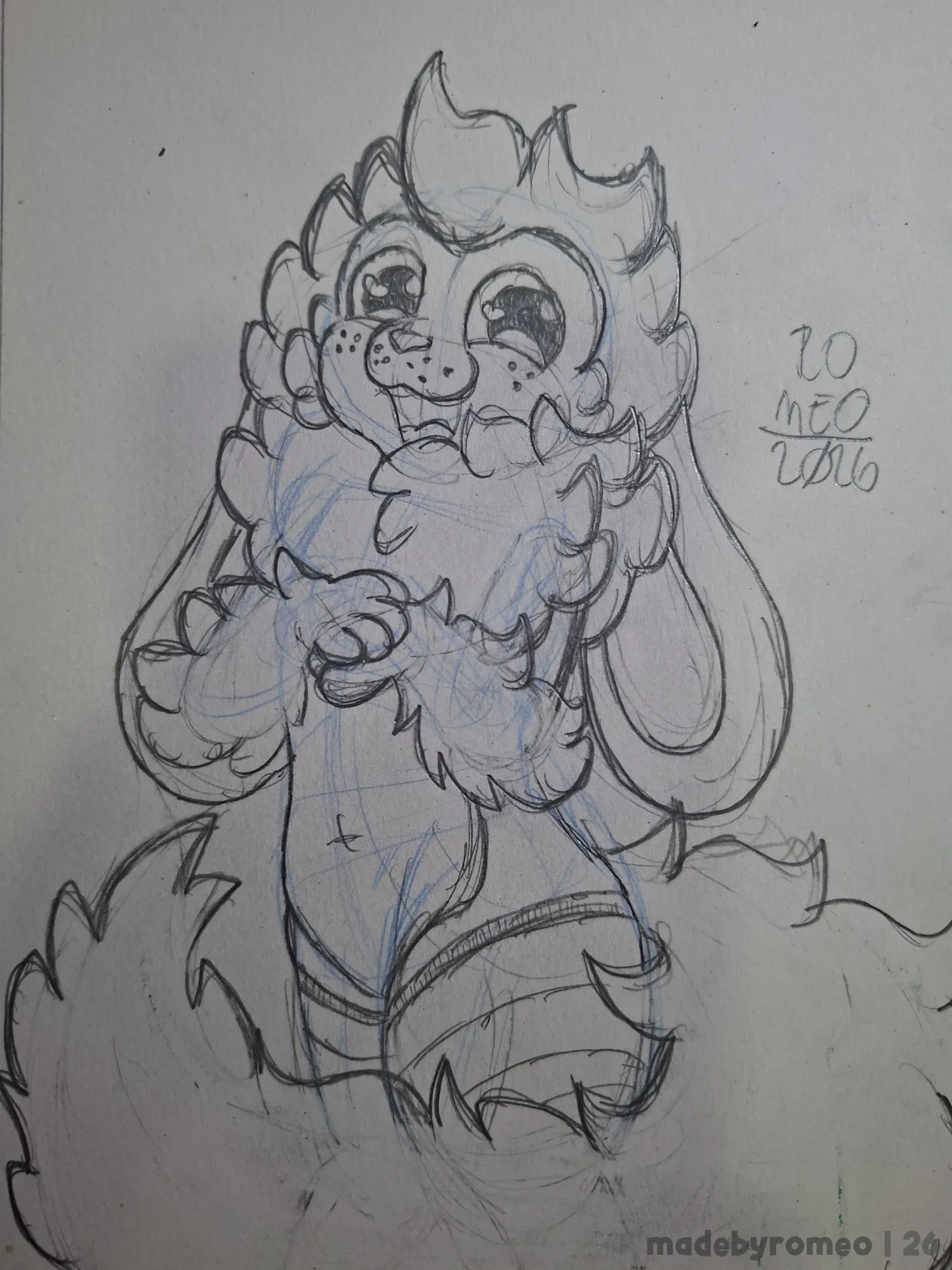 Fiz o Colar de Pelos, olhos, focinho, os pelos das bochechas e o esboço das orelhas, cauda e pernas. Eu vejo que eu poderia fazer um desenho de corpo inteiro do Romeo, mas o desenho ficou até legal assim.