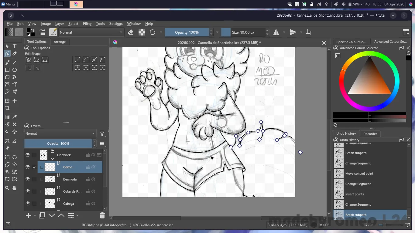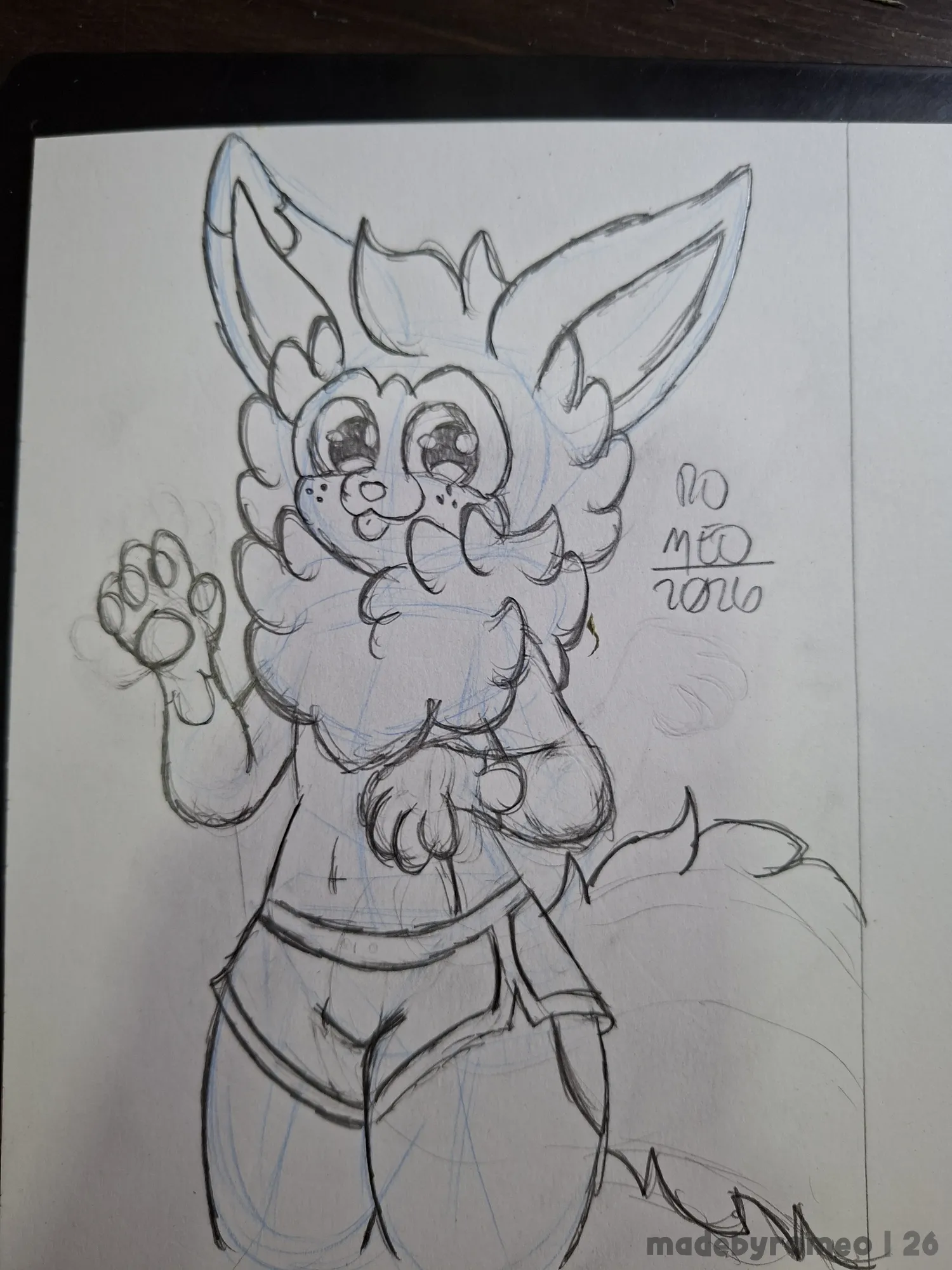 … mas depois, mudei de ideia. De novo. Assim, mudei a posição das patas dele e comecei a fazer um shortinho, o que eu gostei ainda mais. E fiquei muito satisfeito com esse desenho, e assim eu apaguei os traços em excesso e reforcei os principais e fiz a cauda do Cannella.