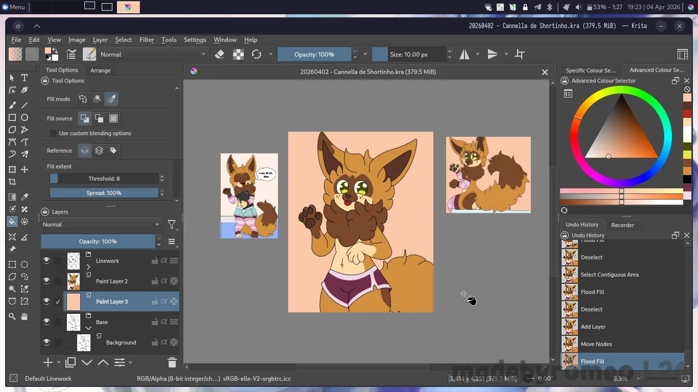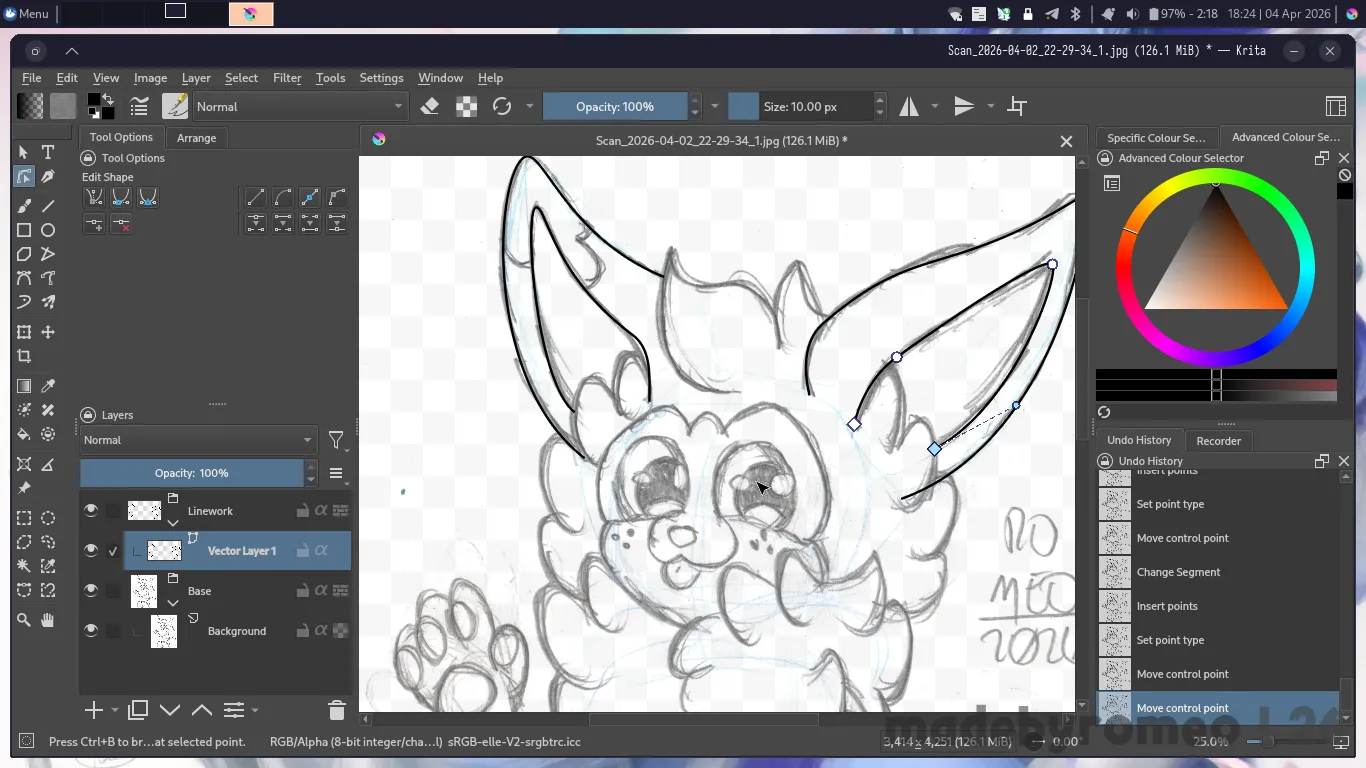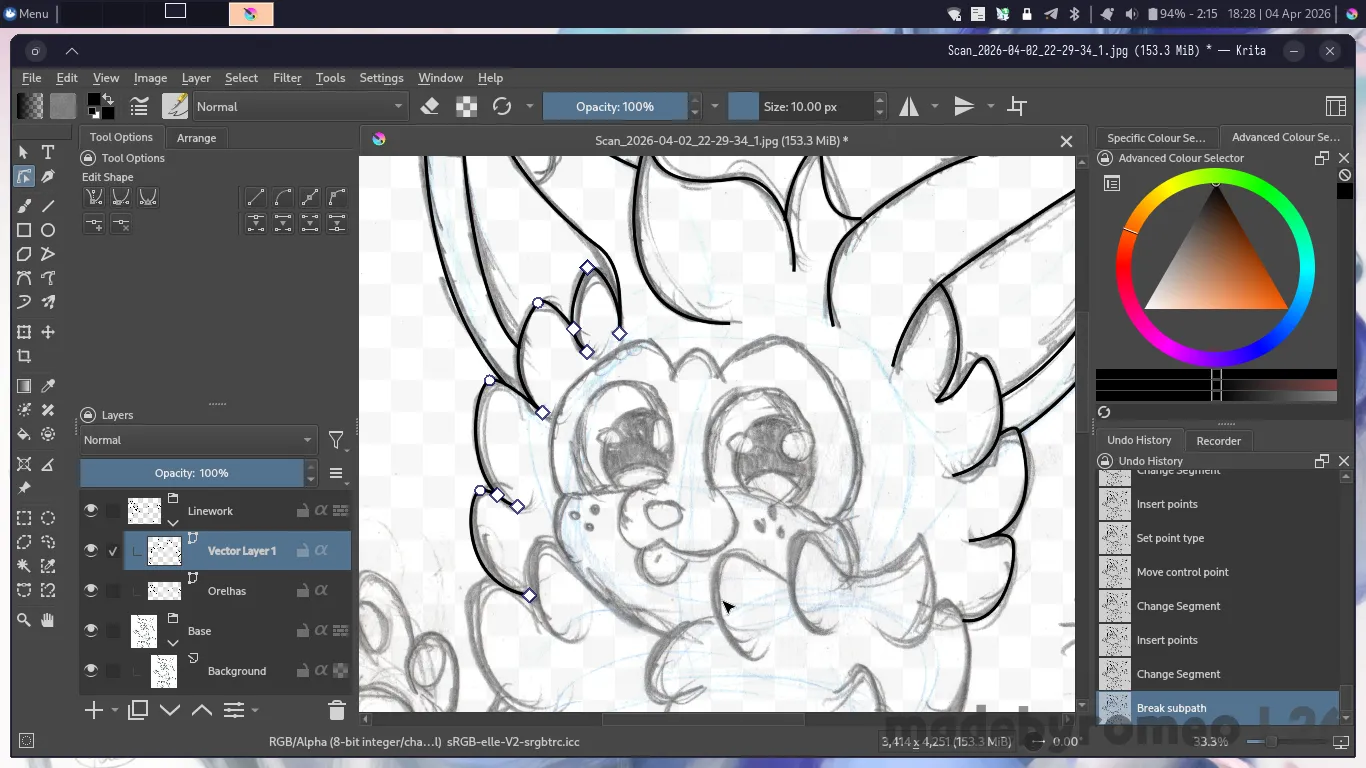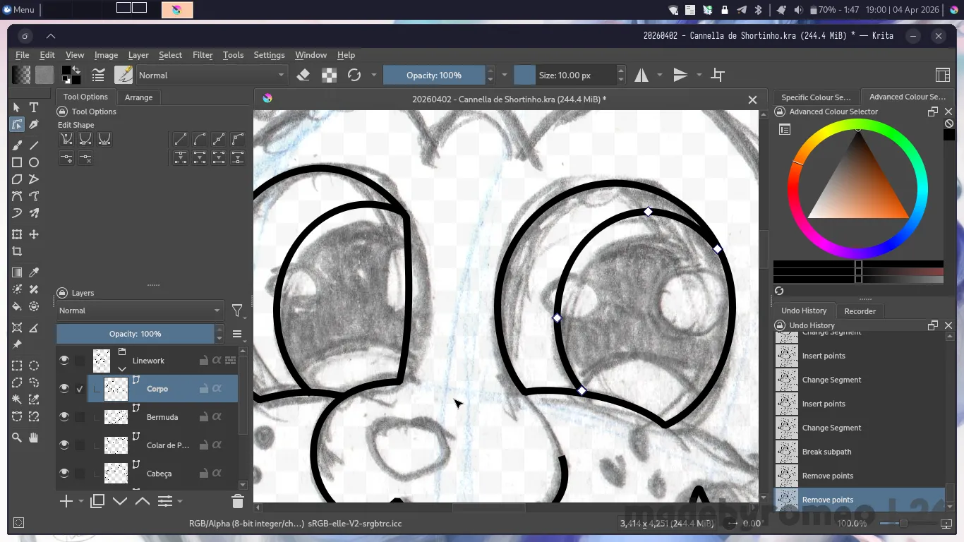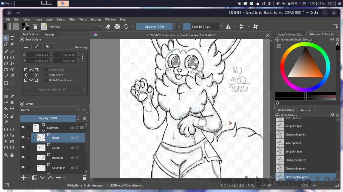 E depois, foi a hora de digitalizar o desenho do Cannella. Eu havia gostado muito de como havia ficado, e achei que ficaria ainda melhor quando eu digitalizasse o que havia feito. E como sempre, depois de organizar as camadas no Krita, comecei a digitalizar o desenho fazendo as orelhas dele…