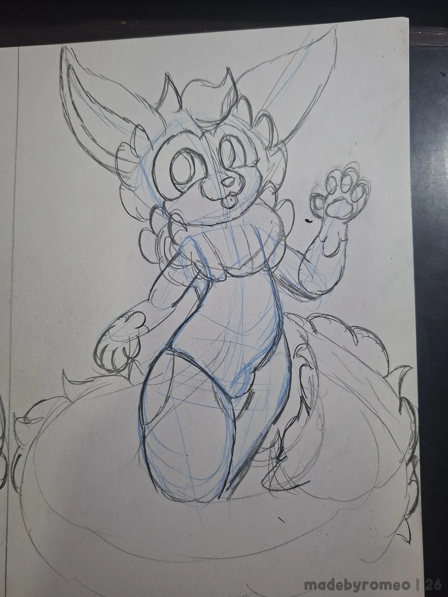 Depois, avancei mias um pouco. Iria fazer a cauda passando na frente dele, mas mudei de ideia. Por fim, apaguei os traços em excesso e reforcei os principais, detalhei os olhos e fiz as sardas do Cannella, assim finalizando o desenho.