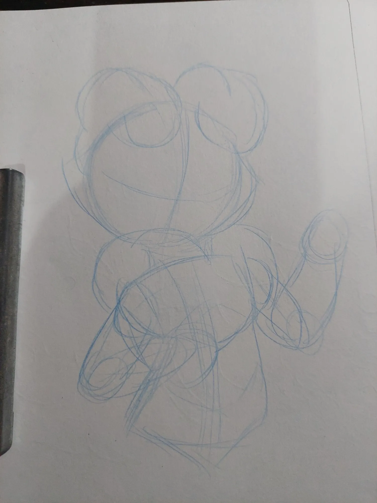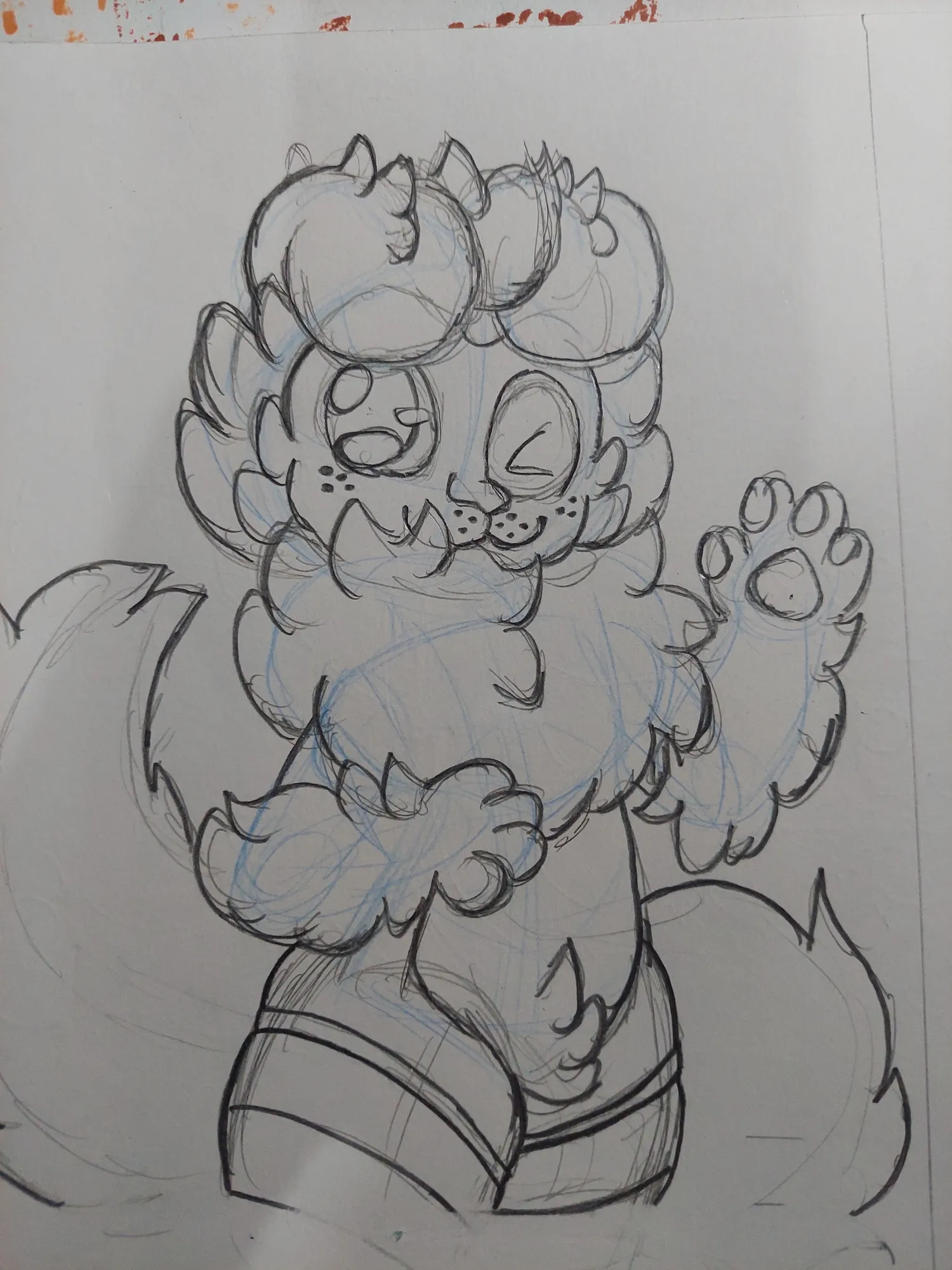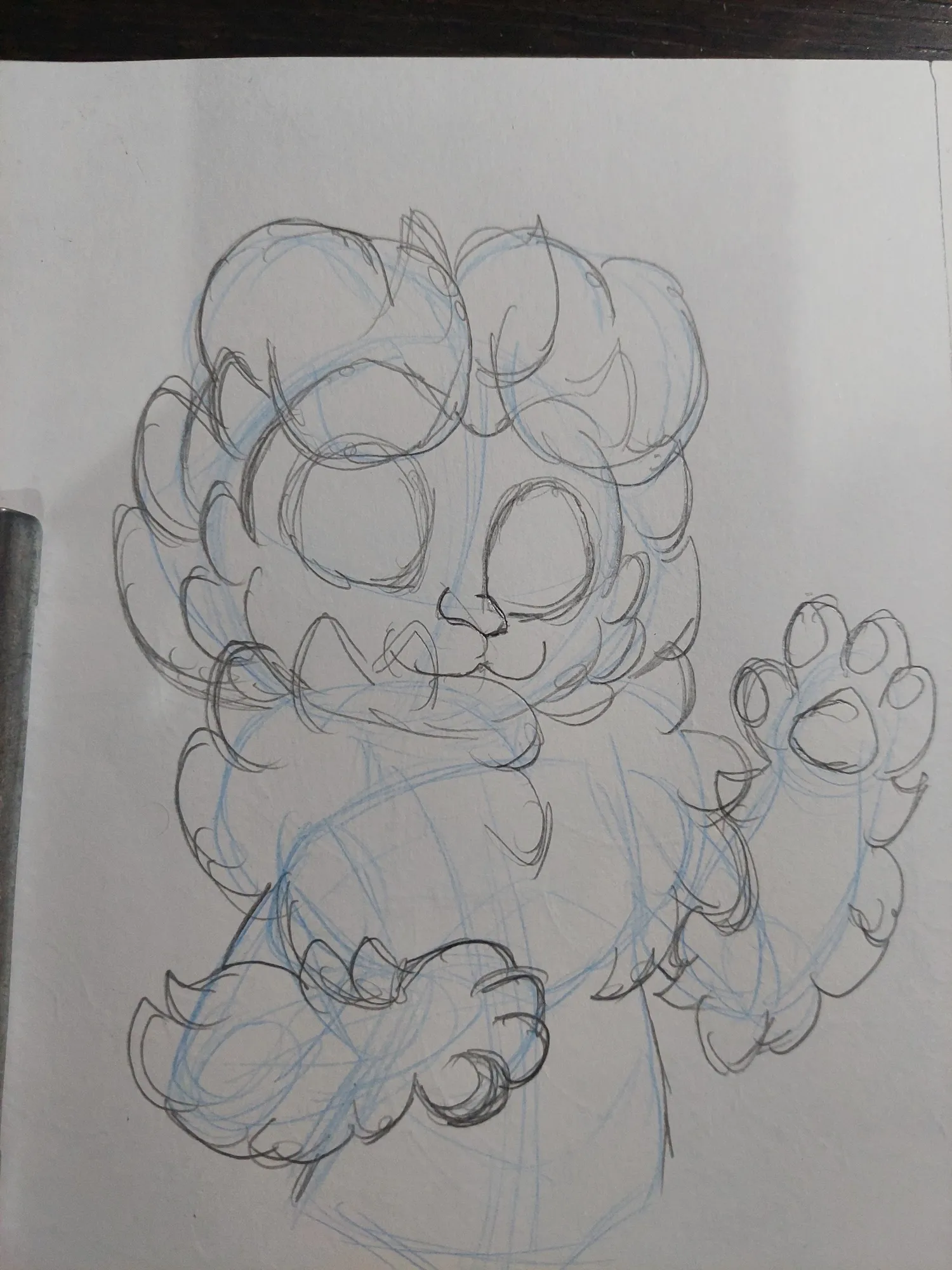 Comecei o desenho como sempre: Com as primeiras linhas da pose e depois para o esboço dele. Depois, fiz o colar de pelos, as orelhas e o esboço das patas, e aqui eu já estava gostando bastante desse desenho.