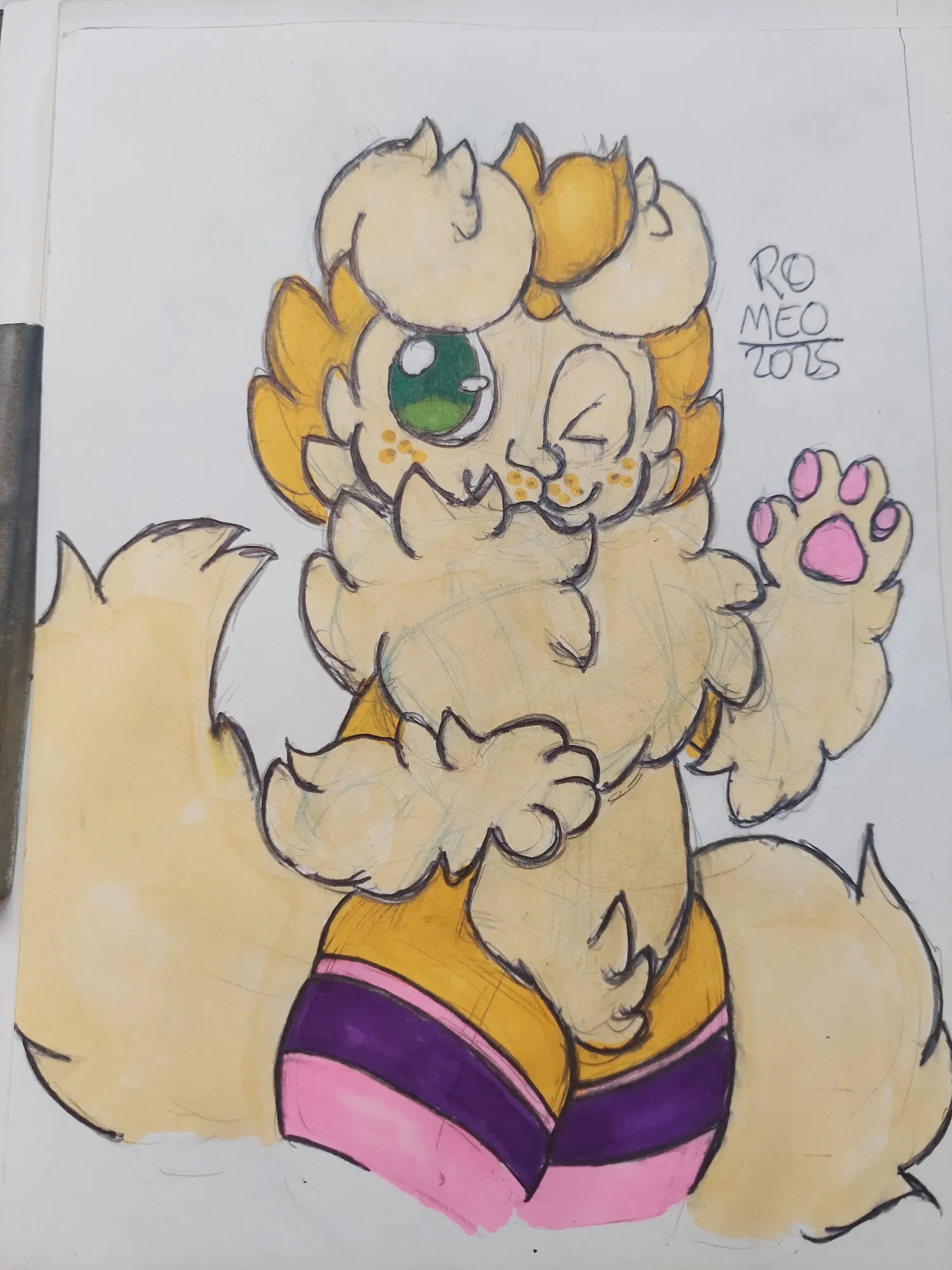 Contornei o desenho com a caneta, e depois comecei a colorir as partes claras do Romeo, olhos, as almofadas de pata e as meias do Romeo. Assim, finalizei o desenho.