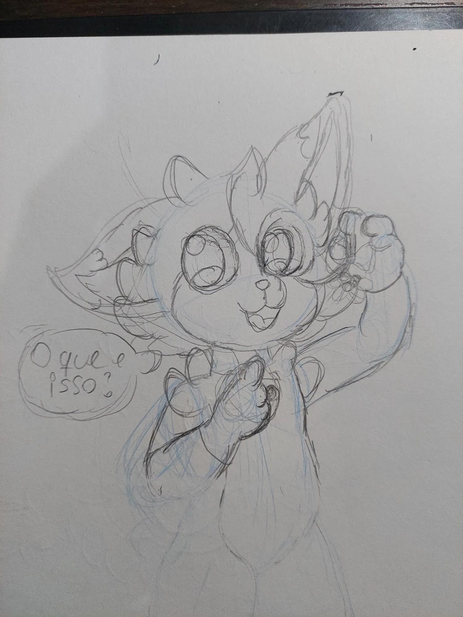 Comecei o desenho como sempre: Com as primeiras linhas da pose, e depois fui para o esboço. A minha intenção no esboço, era fazer o Mocha com o visco na altura do rosto e a outra pata no quadril dele.