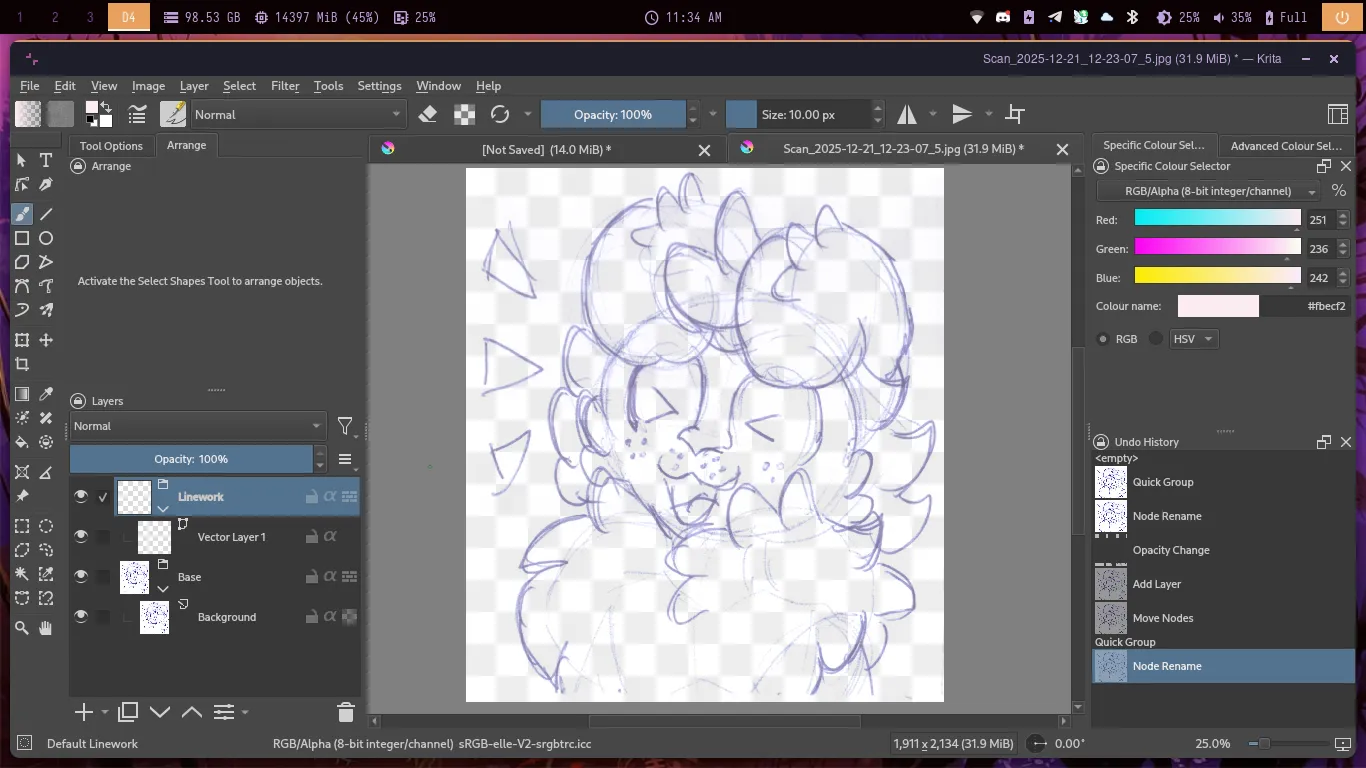 Comecei a Digitalização pela organização no Krita. Criei uma pasta com a “base” do desenho, que é o ele no tradicional para fazer a digitalização e outra pasta com a Linework, que são as linhas do desenho.