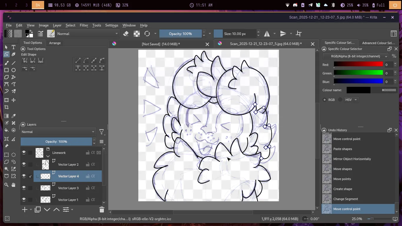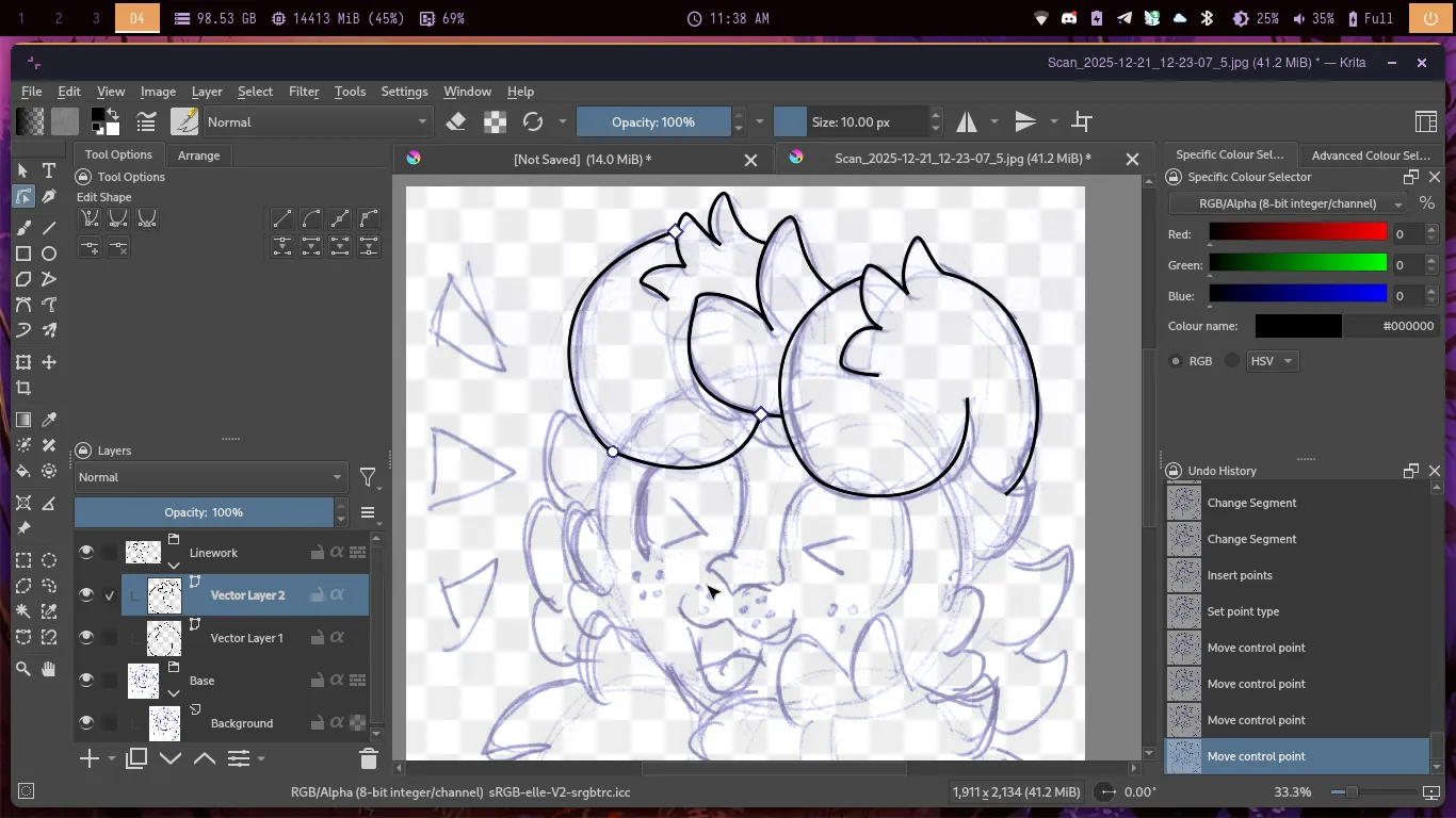 E assim, comecei a digitalizar o desenho. Começando primeiro pelas orelhas e a franja do Romeo, que são até que bem fáceis de fazer. Para fazer as linhas eu uso a camada de Vetor, já que eu uso o mouse para fazer a digitalização do desenho, a ferramenta de Curva de Bézier para fazer a linha e modelar ela do jeito que quero.