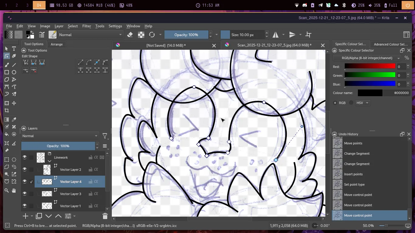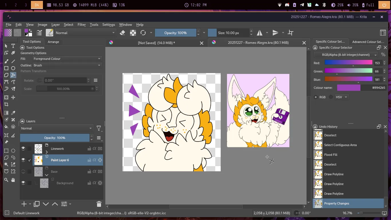 Aqui é um dos pontos do porquê eu escolhi o Krita: Ele reúne o melhor do Vetor, que é ter a possibilidade de modelar a linha com uma precisão maior, já que não uso uma mesa digitalizadora (e nem gosto de usar uma) e o melhor do Bitmap, que é poder selecionar as áreas que quero colorir e usar o balde de tinta pra isso.