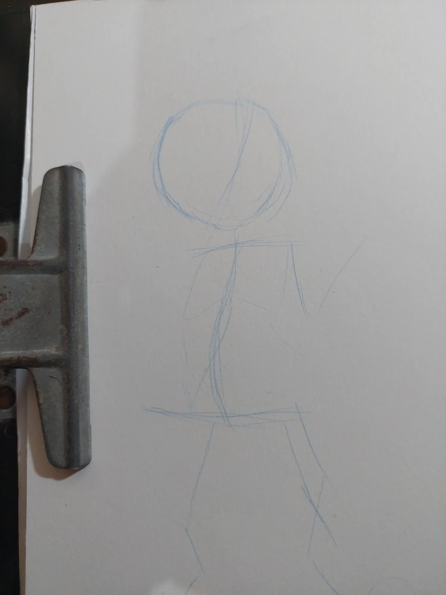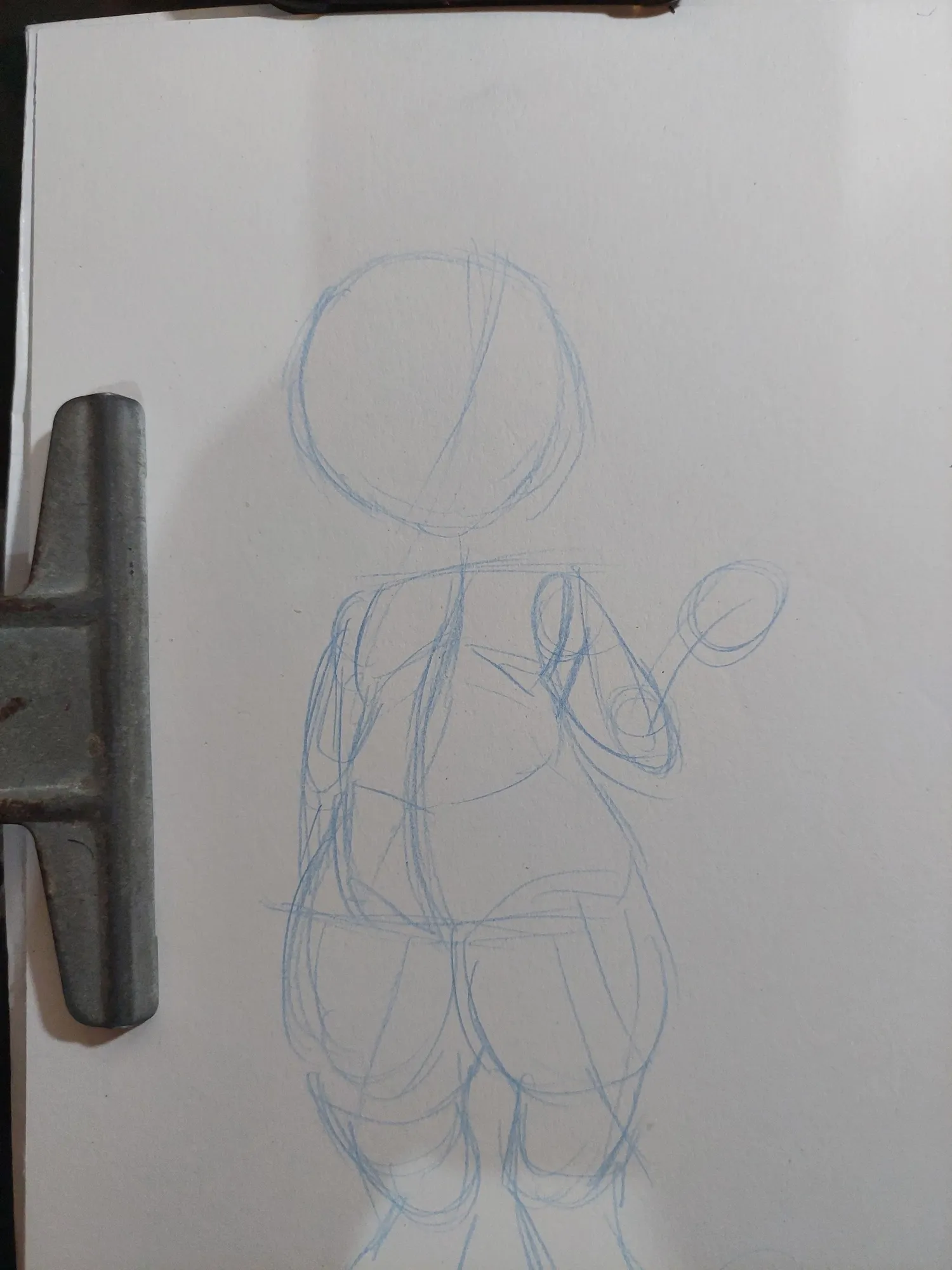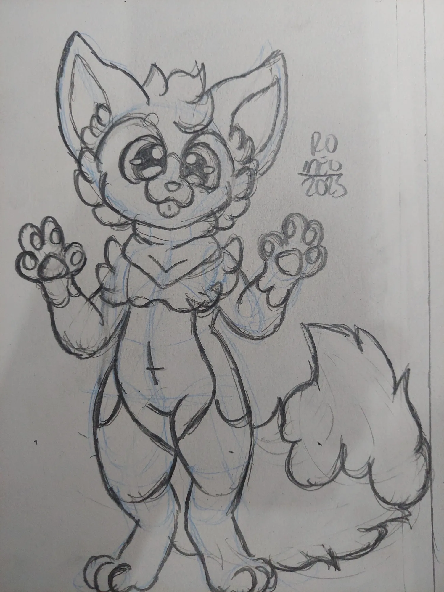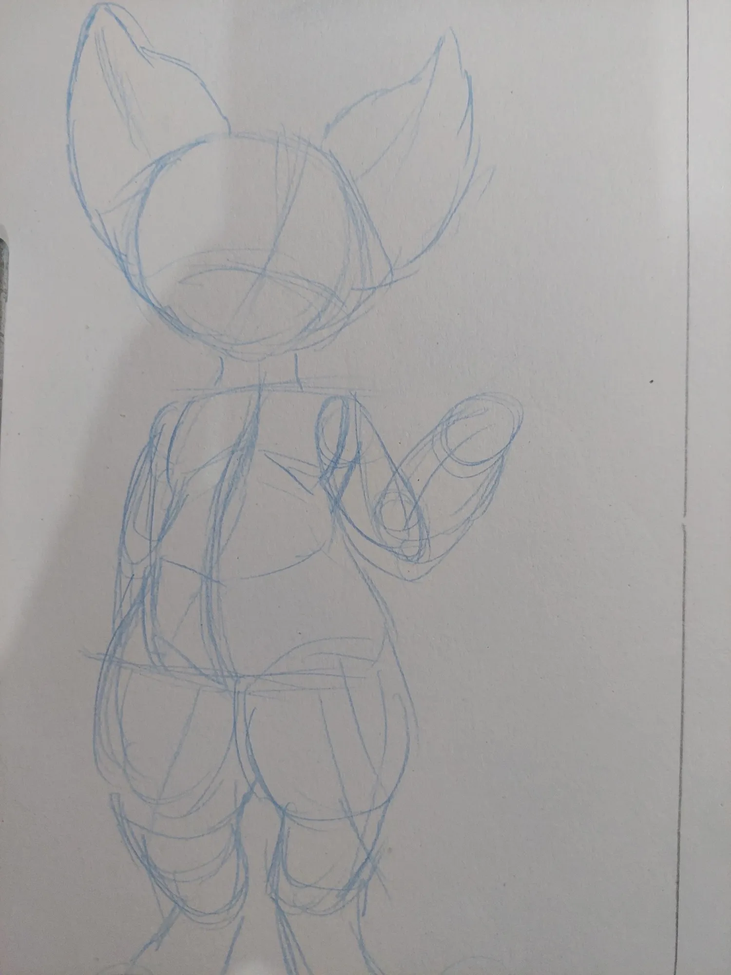 Comecei o desenho como sempre: Com as primeiras linhas do corpo. Inicialmente, eu iria fazer um personagem paraddo, com uma das patas próximas ao corpo e a outra levantada, como se ele estivesse acenando. E assim, prossegui no esboço com essa ideia.