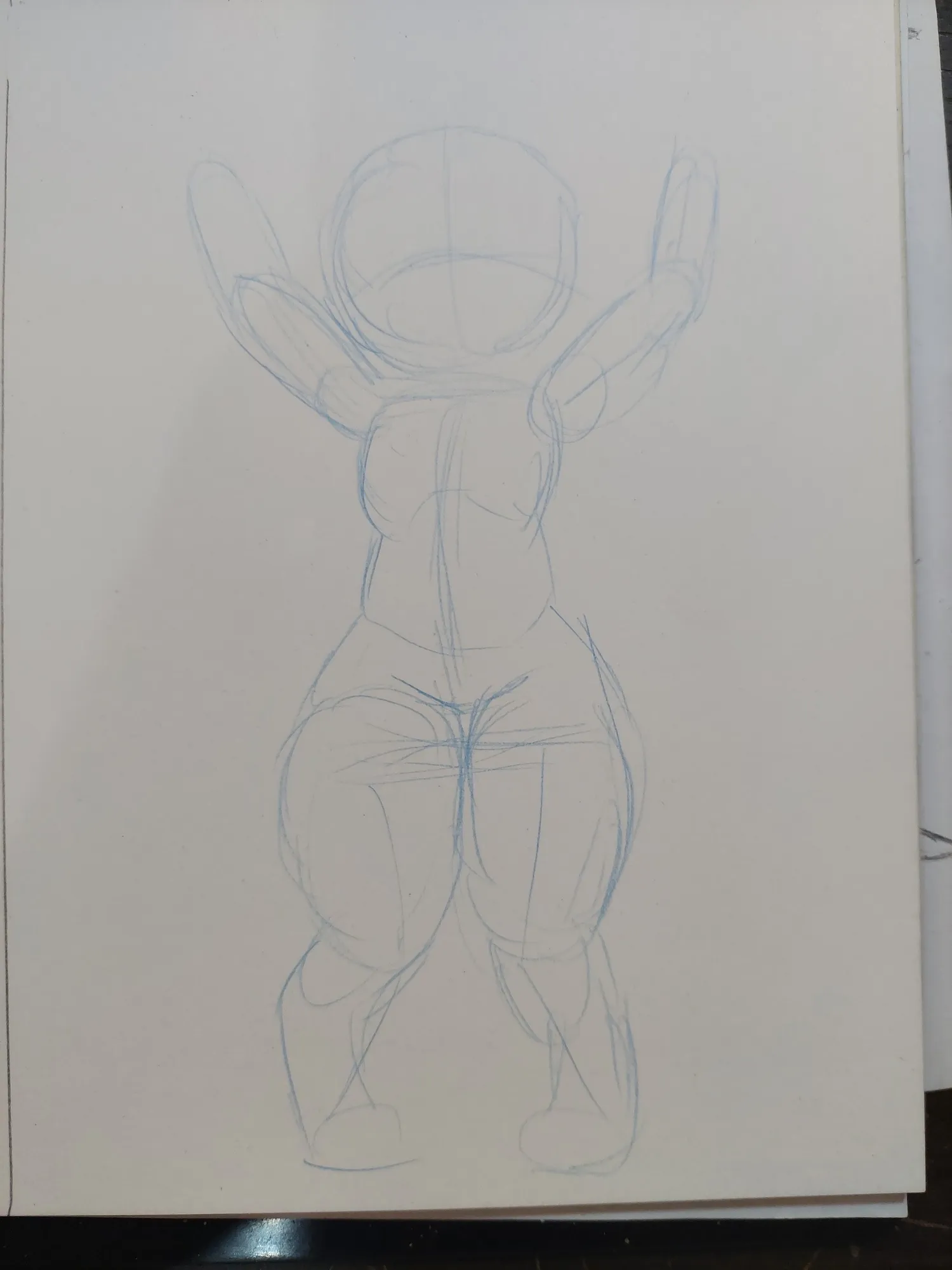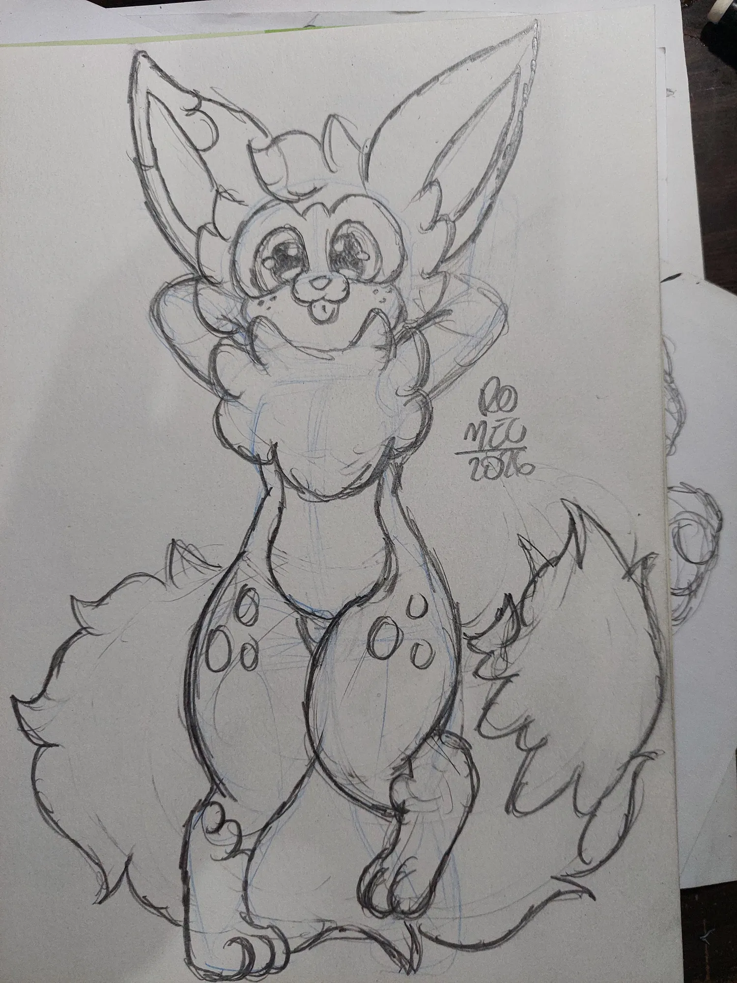 Comecei o desenho com as primeiras linhas da pose, e logo após, eu fiz o esboço, onde fiz os braços, coxas, patas e o corpo do personagem. Eu poderia desenhar qualquer um dos personagens que tenho, mas acabei optando pelo Cannella.
