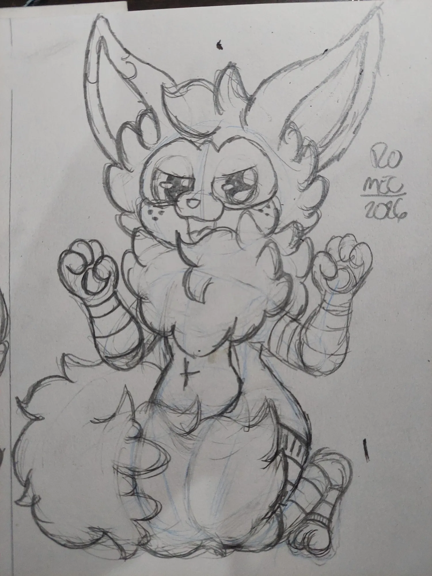 Comecei o desenho como sempre: Com as primeiras linhas do corpo. Eu queria fazer o personagem de joelhos, e foi isso que fiz, e adorei como ficou. Depois, fui para o esboço do desenho, onde decidi pelo Cannella, e assim fiz os braços, coxas, patas, o colar de pelos e o esboço da cauda.