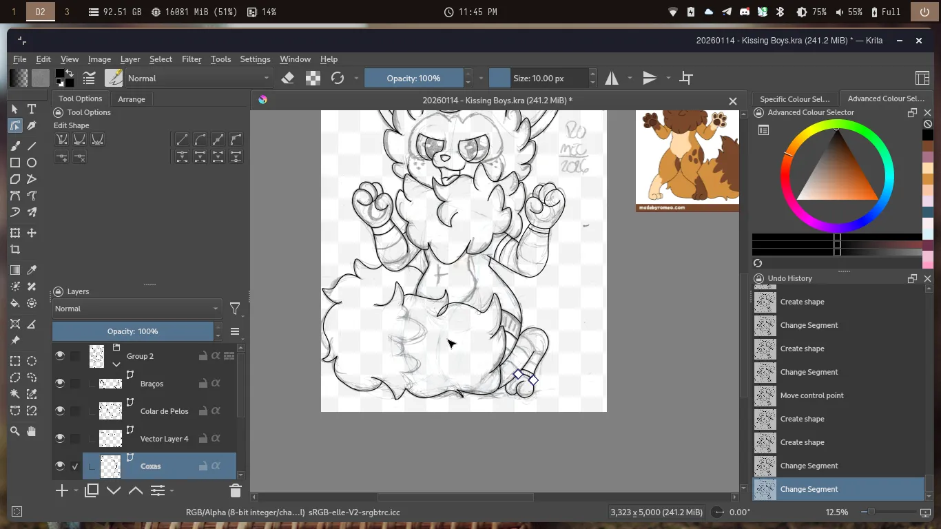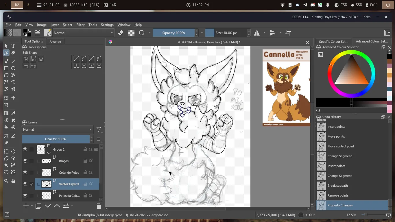 Depois avancei mais no desenho, onde fiz a cauda, orelhas, o rosto do Cannella e os dedos das patas. Também deixei o colar de pelos mais peludinho e depois fiz os pelos da cabeça. Também coloquei as meias e mais alguns outros detalhes, e assim o desenho estava caminhando para a finalização.