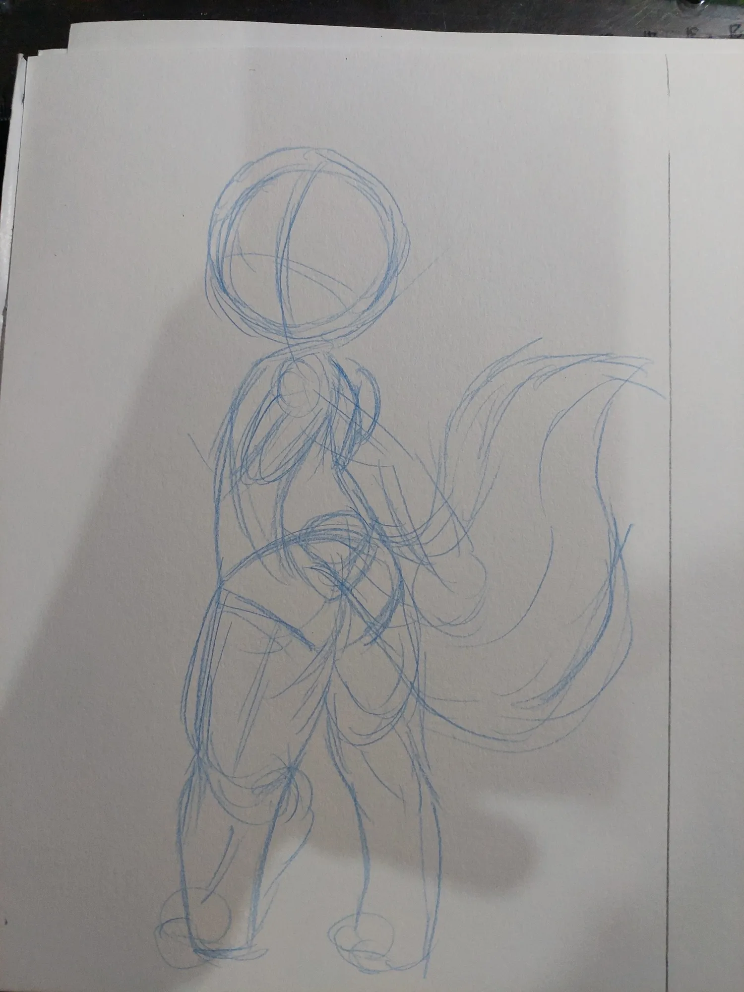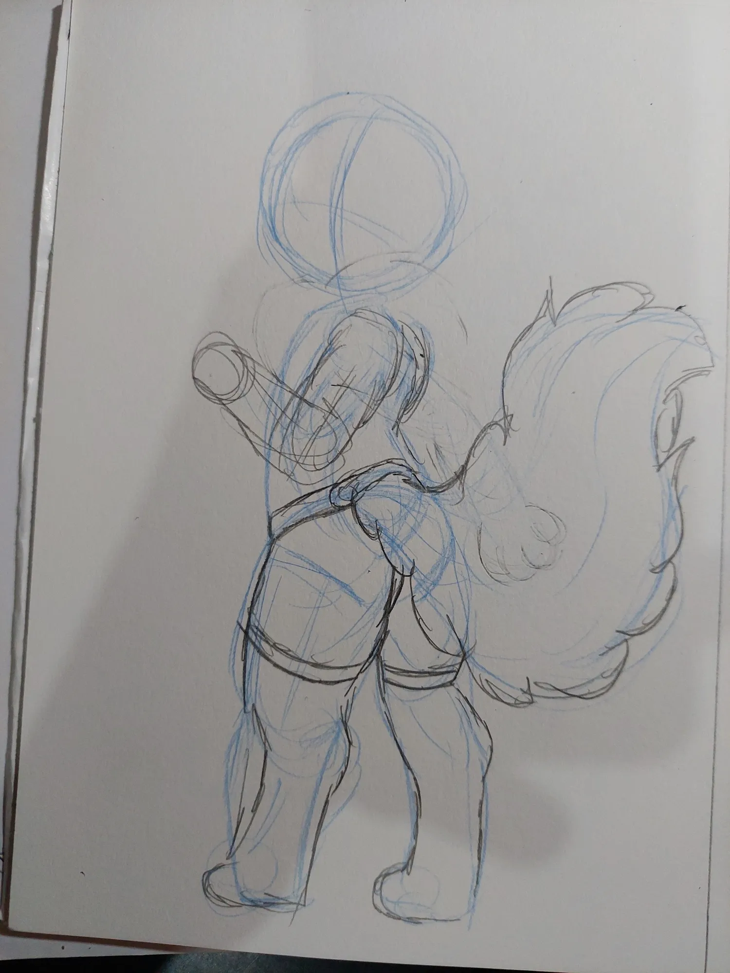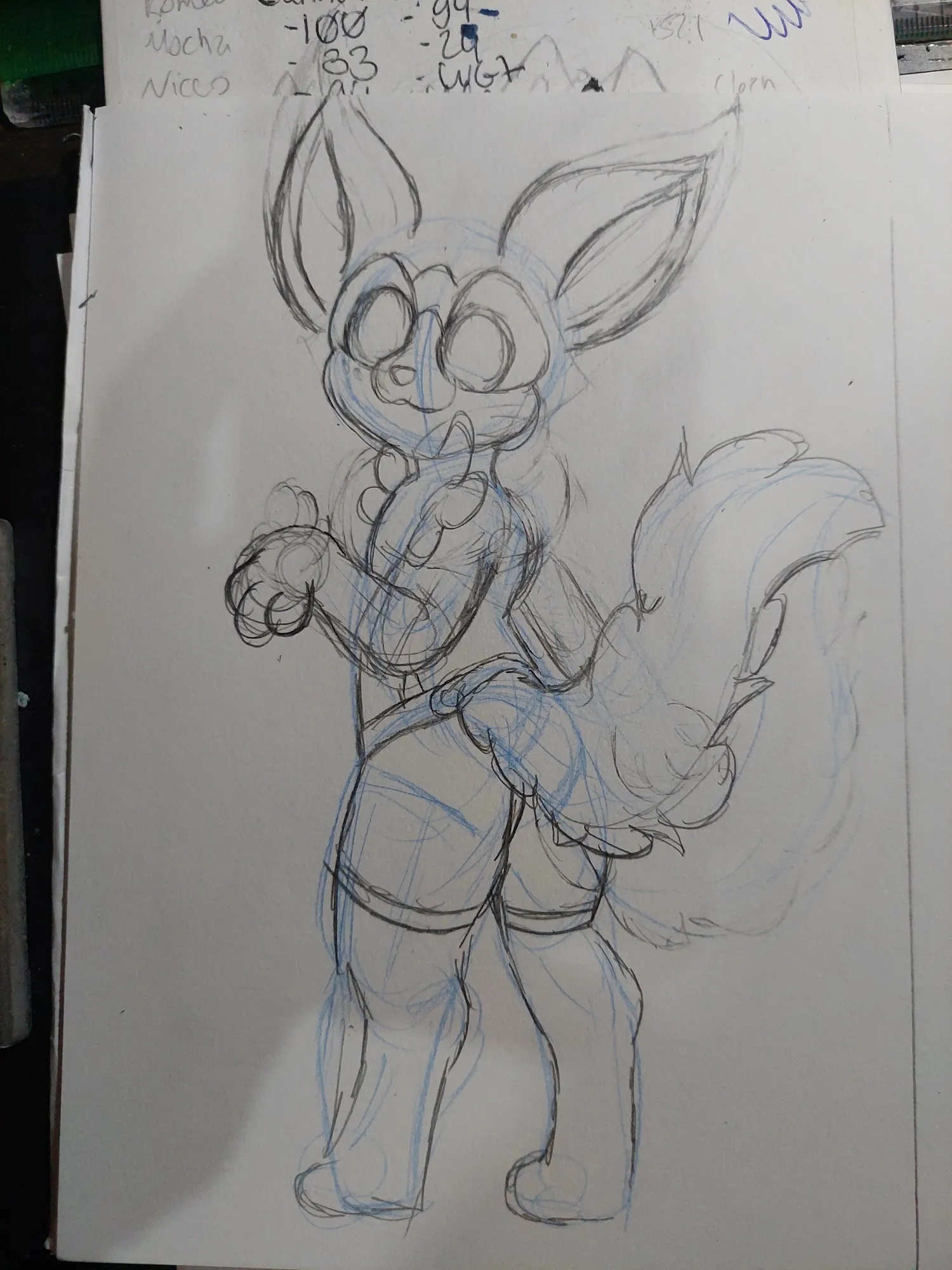 Depois, comecei a detalhar mais o esboço, fazendo as pernas, o shortinho e a cauda. Inicialmente pensei no Cannella, então fiz a cauda mais espessa, e eu gostei bastante disso.