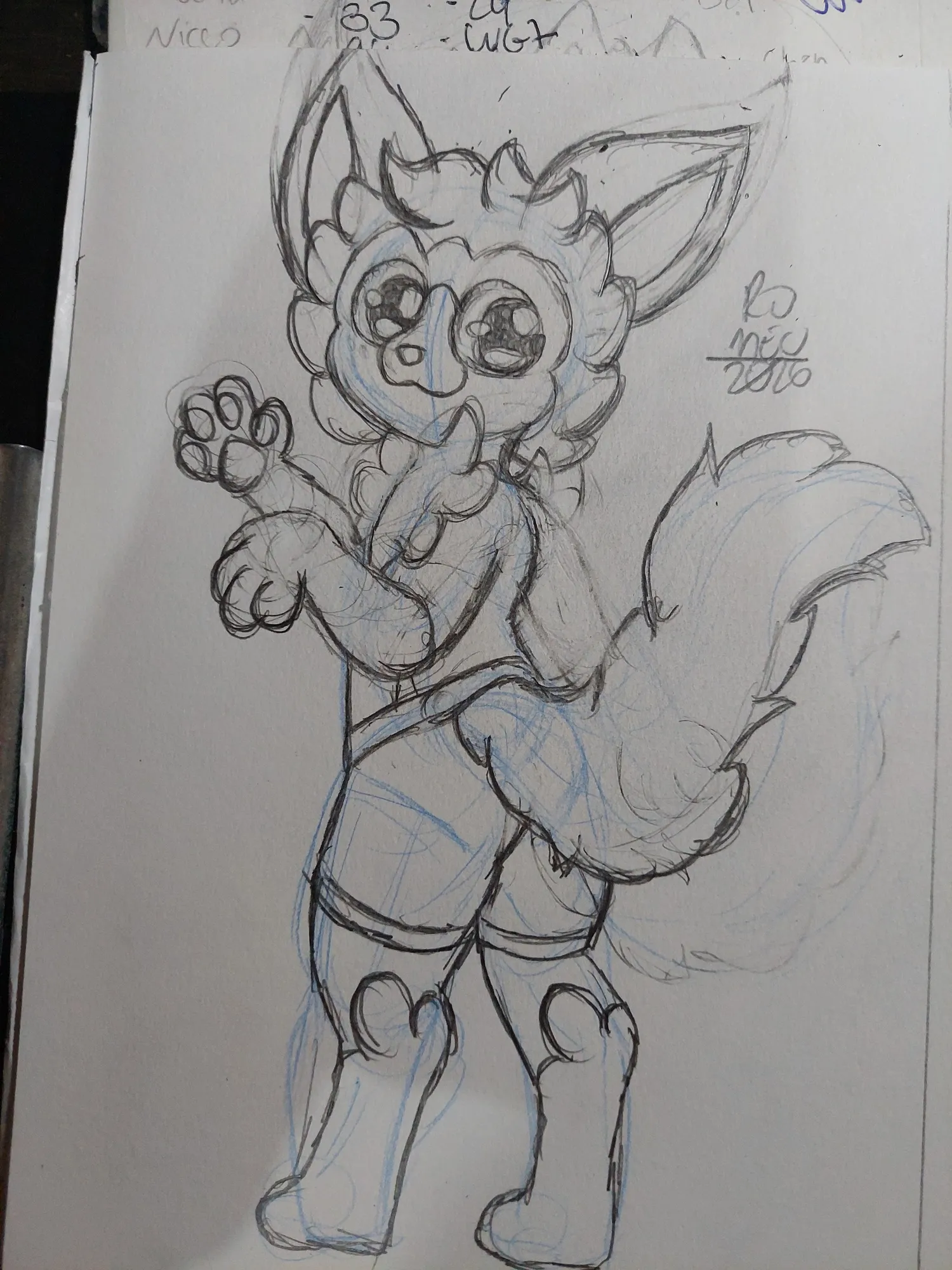 Depois fiz os pelos da cabeça, detalhei os olhos, fiz as marcas das patas e refinei mais o braço. Mas logo achei que o Wonny ficaria mais fofo acenando, então foi o que fiz. Apaguei os traços em excesso e reforcei os principais e pintei as pupilas dos olhos do Wonny, assim finalizando esse desenho.