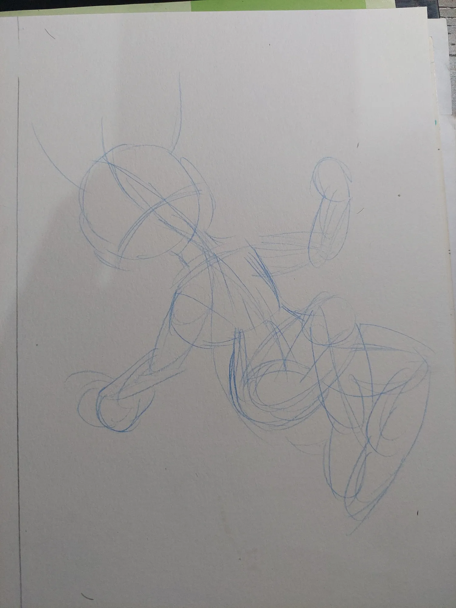 Comecei o desenho como sempre: Com as primeiras linhas da pose e depois fui para o esboço do desenho. Decidi fazer o personagem com os braços estendidos e as pernas um pouco mais dobradas, uma pose que eu realmente não faço tanto.