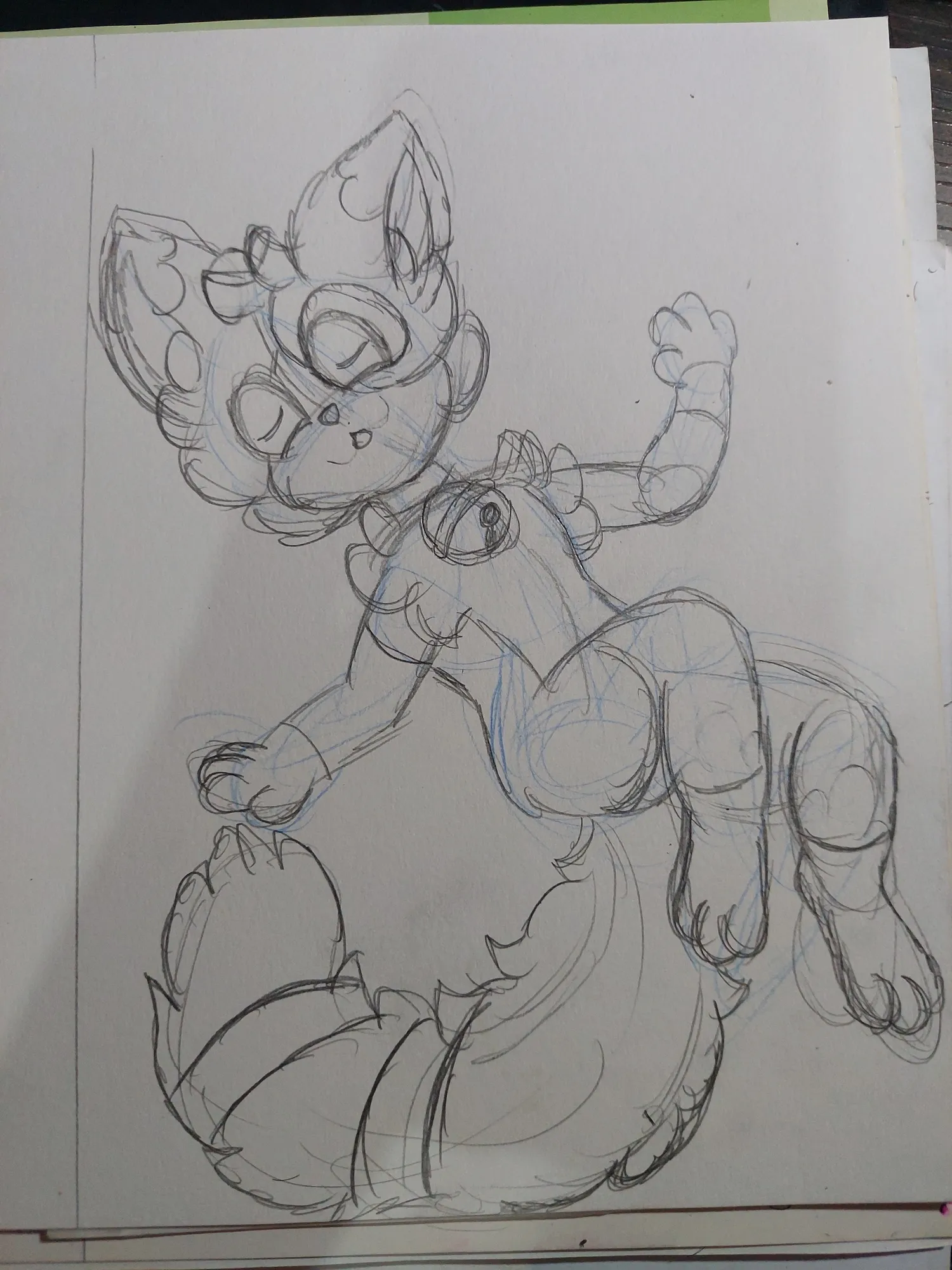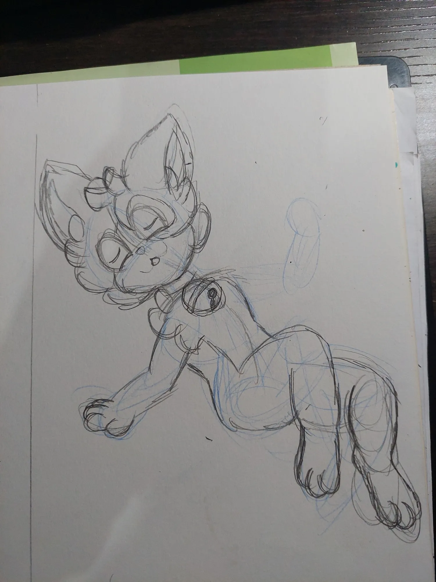 Depois avancei bastante no esboço, onde fiz a outra pata, cauda e avancei nas marcas do topo. Mas eu não tinha gostado de como a pata ficou, então mudei um pouco a posição dela…