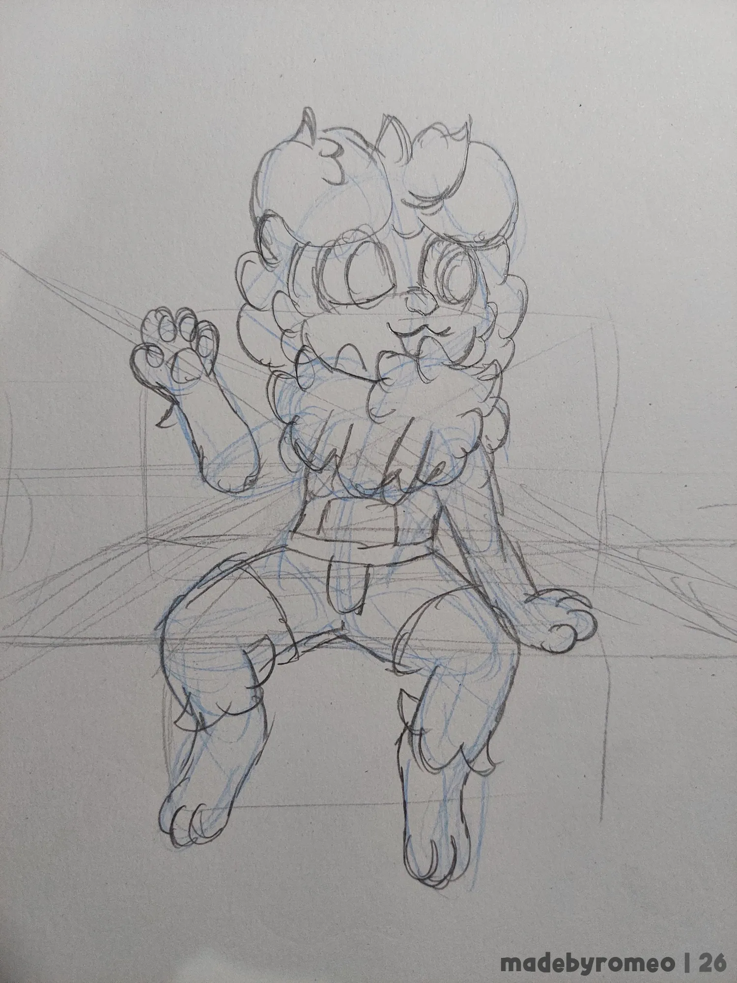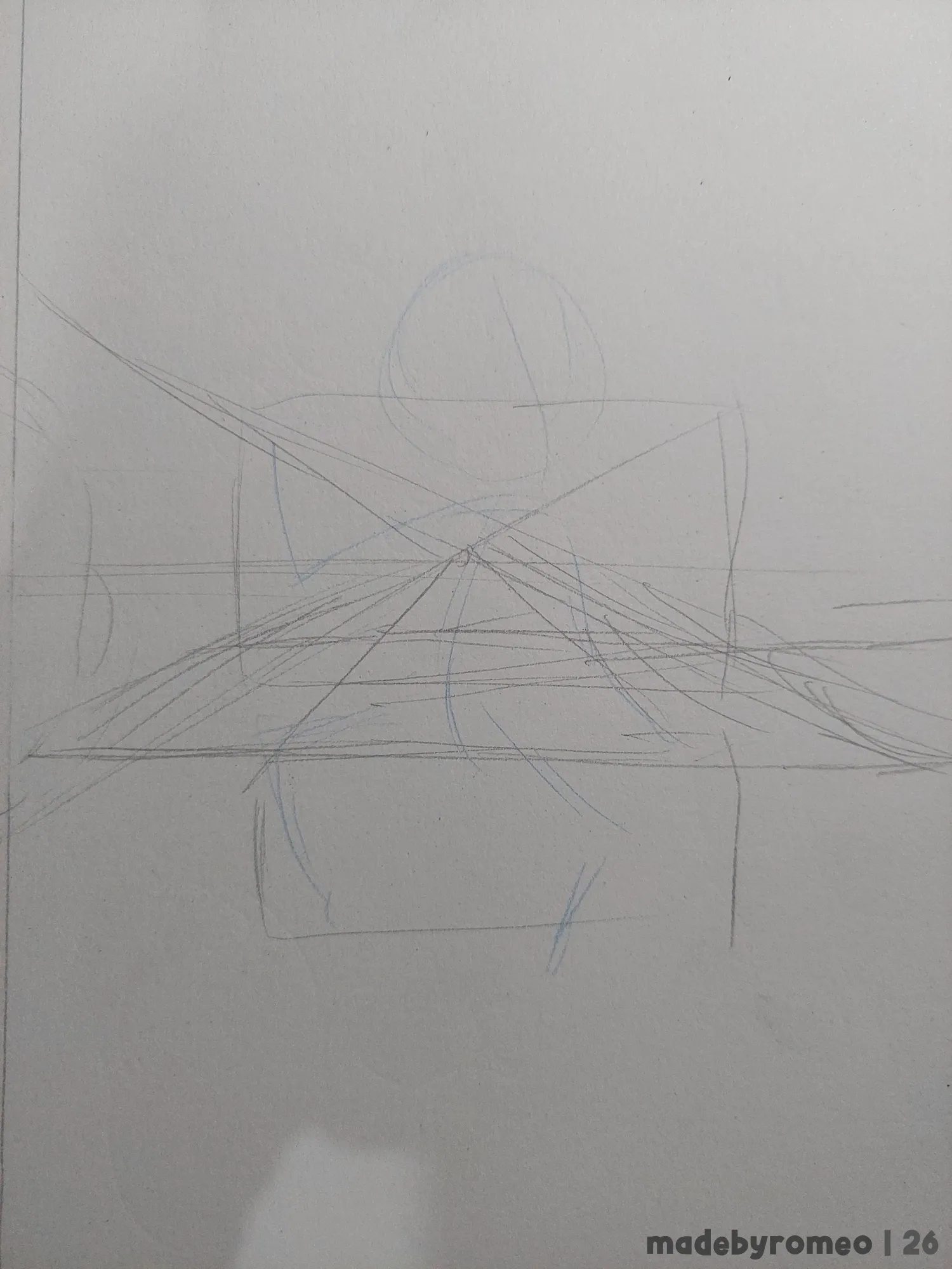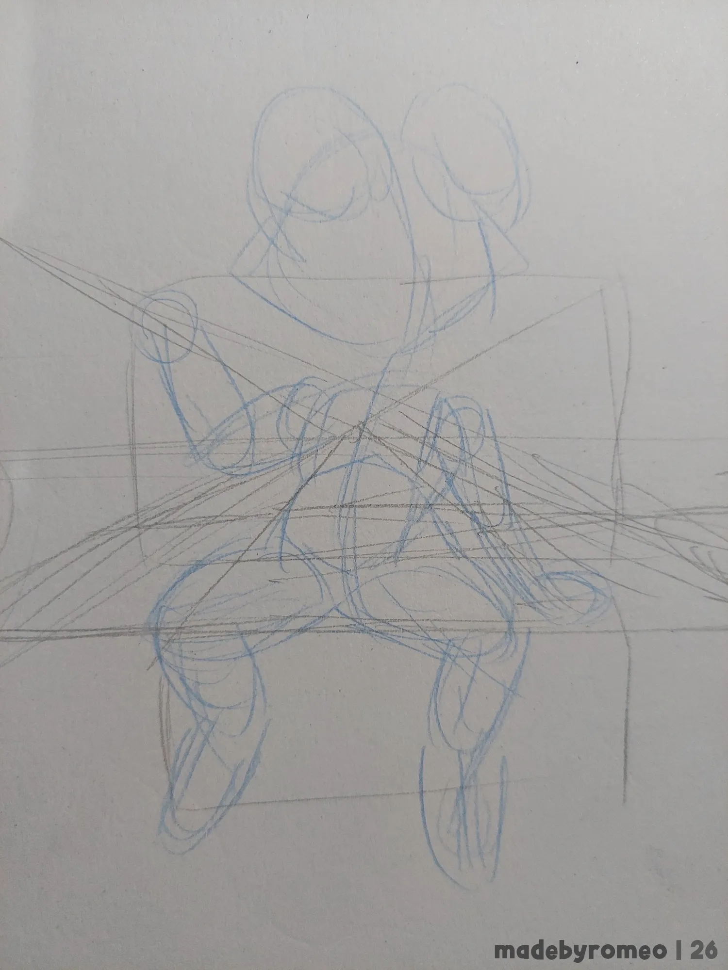 Comecei o desenho fazendo a perspectiva e colocando as primeiras linhas da pose do Romeo. Eu não estava muito confiante no começo, mas decidi começar a confiar no Processo. Depois fiz o esboço do Romeo, o que comecei a gostar mais.