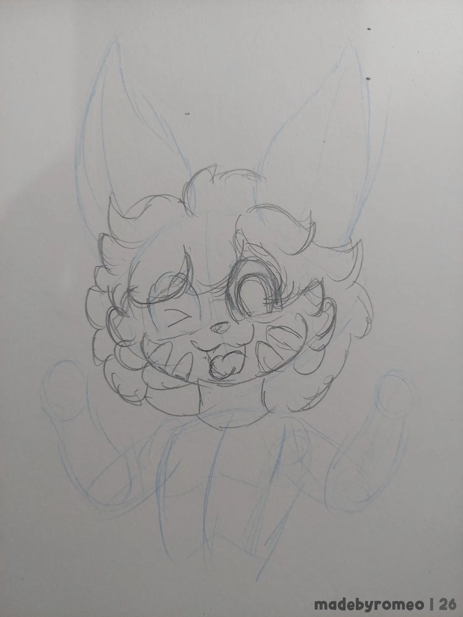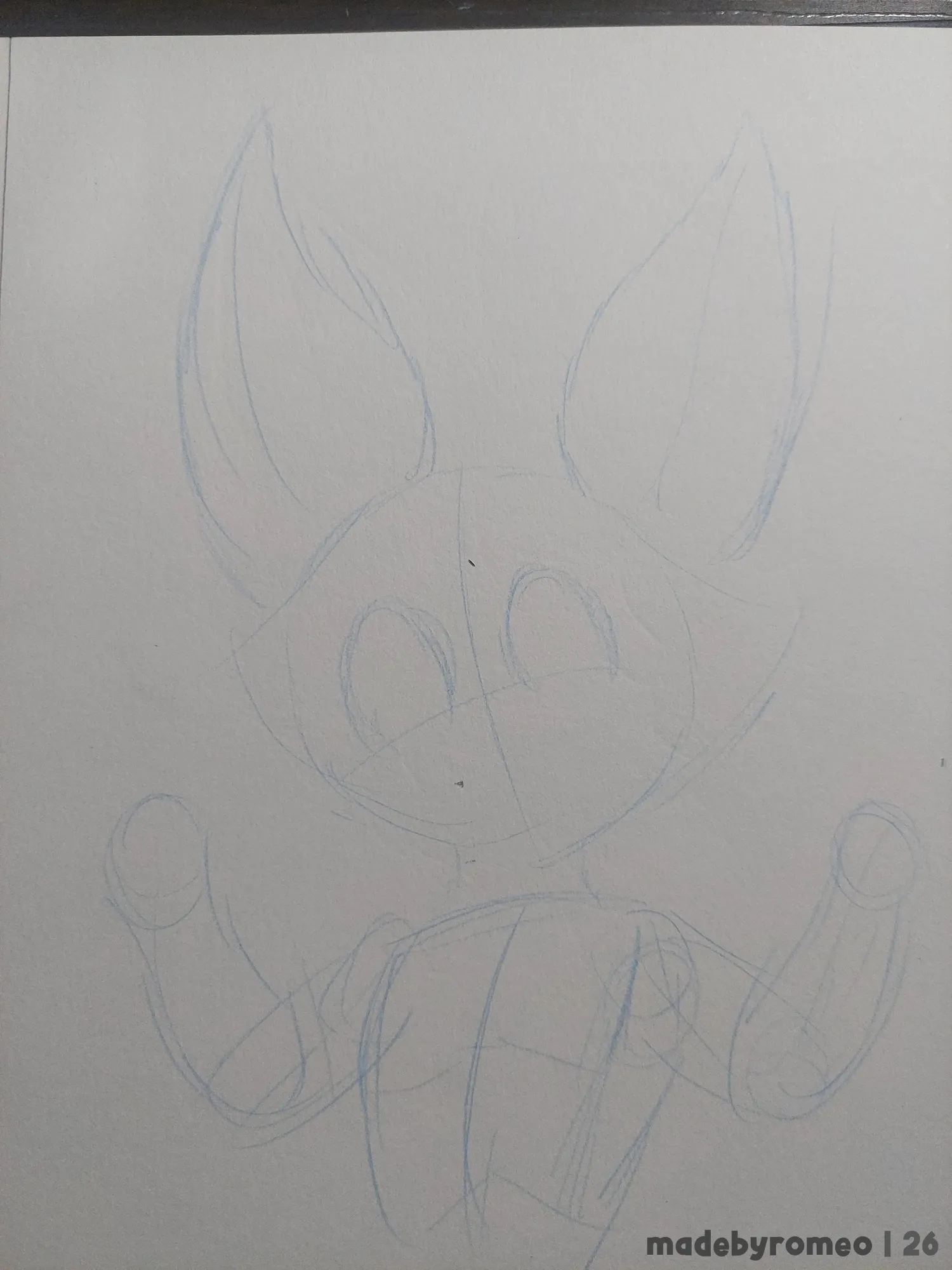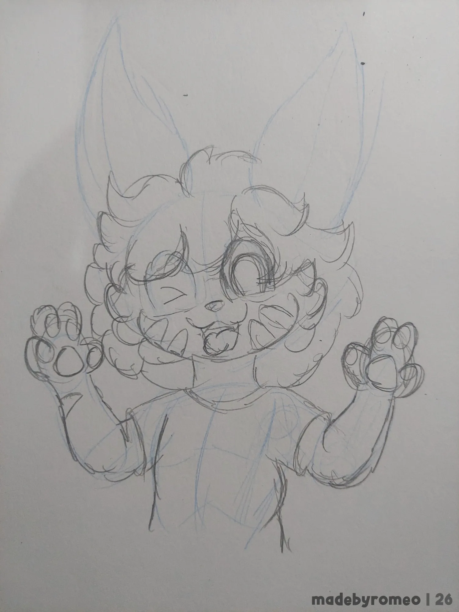 Comecei o desenho como sempre: Com as primeiras linhas da pose e depois indo para o esboço dele. Como a referência dele tinha mais coisas, eu pude fazer ele mostrando as patas, algo como “Show your goods, Ollie!”. E assim segui no esboço.