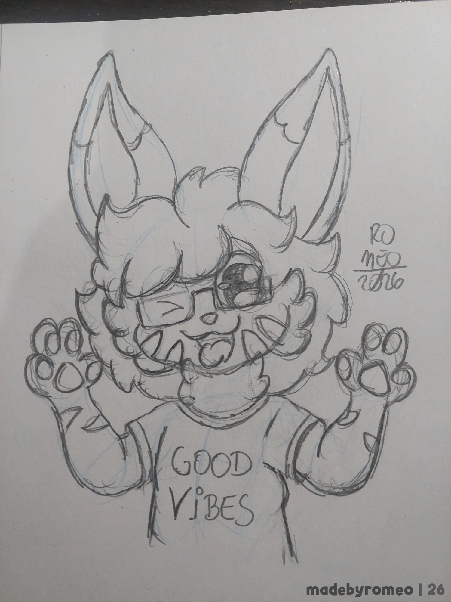 Por fim, fiz as orelhas, óculos e as marcas das orelhas, apaguei os traços em excesso e reforcei os principais, detalhei a camiseta e pintei as pupilas dos olhos do Ollie.