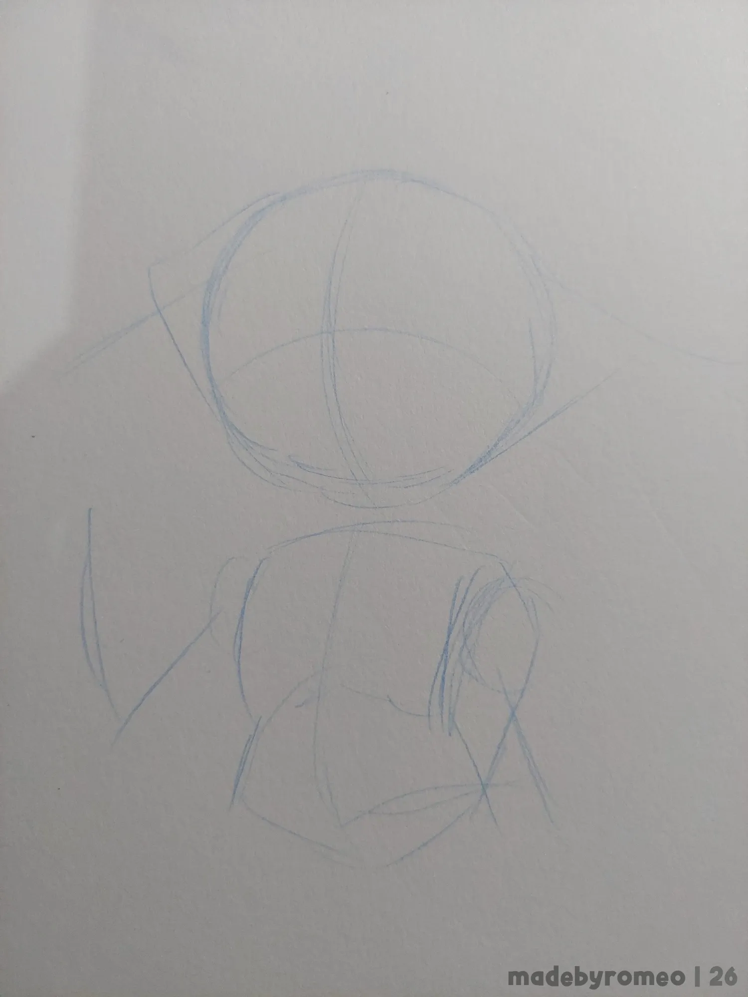 Depois, detalhei os olhos e comecei a apagar os traços em excesso. E por fim, reforcei os traços principais e fiz as coxas do Romeo, somente para dar uma “continuidade” ao desenho.