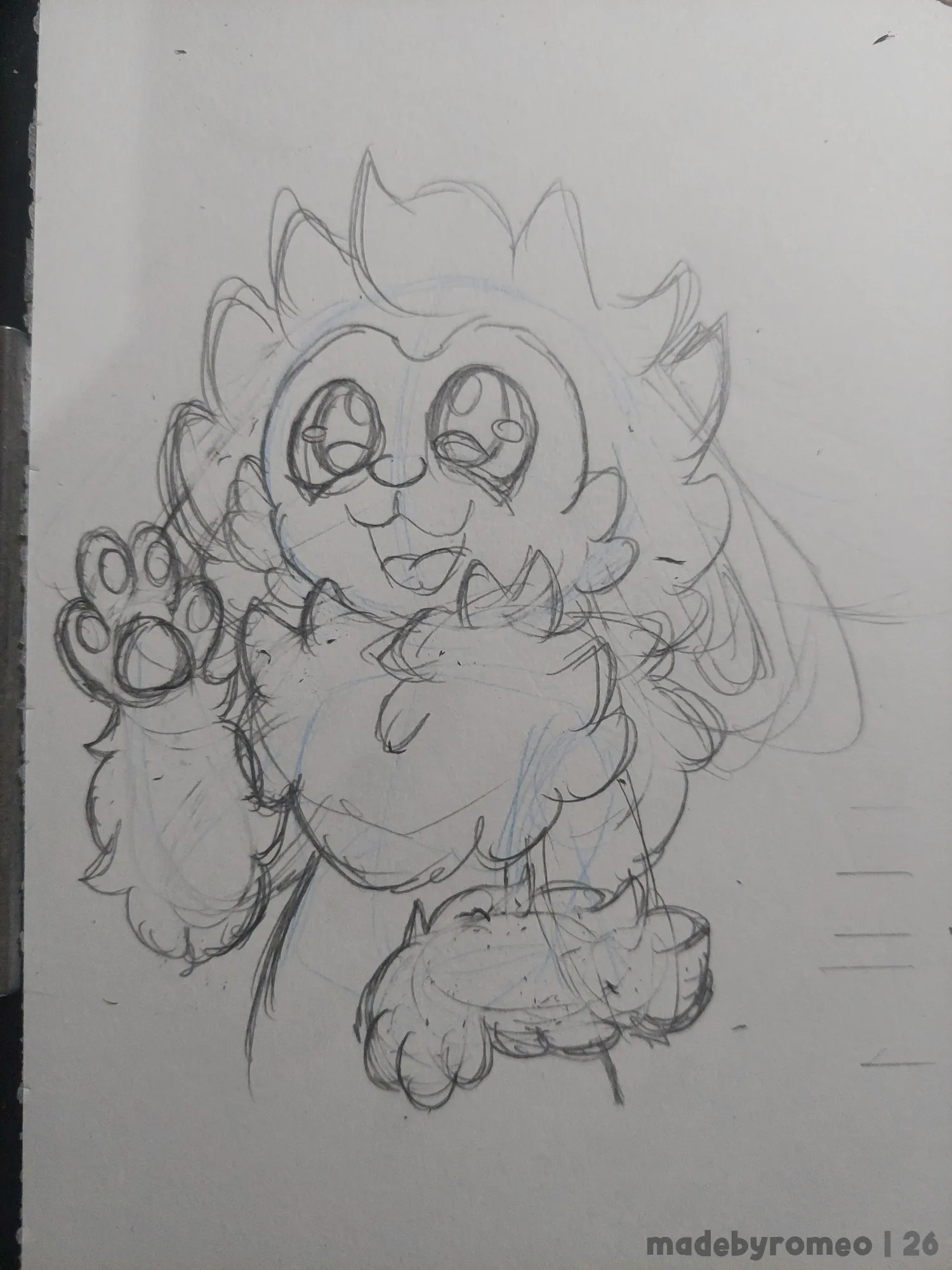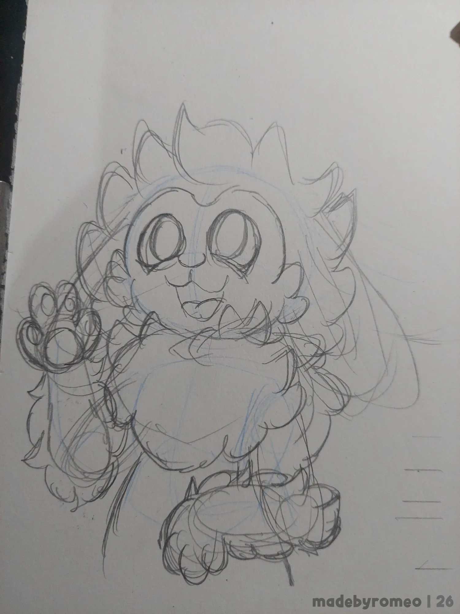 Comecei o desenho como sempre: Com as primeiras linhas da pose, e logo em seguida, fazendo o esboço. Aqui decidi fazer o Romeo com um dos braços mais próximos ao corpo e acenando com o outro, enquanto ele olha levemente pra cima. Eu adorei essa ideia. É uma pose comum, mas que poderia ser legal para esse desenho com essas novas orelhas do Romeo.