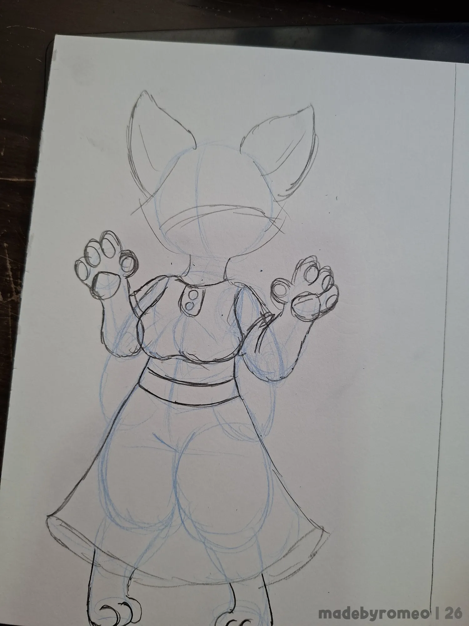 Comecei o desenho como sempre: Com as primeiras linhas da pose e depois com o esboço do desenho. Com isso comecei a dar forma à Ruby, fazendo as orelhas, patas, seios e o vestido dela.