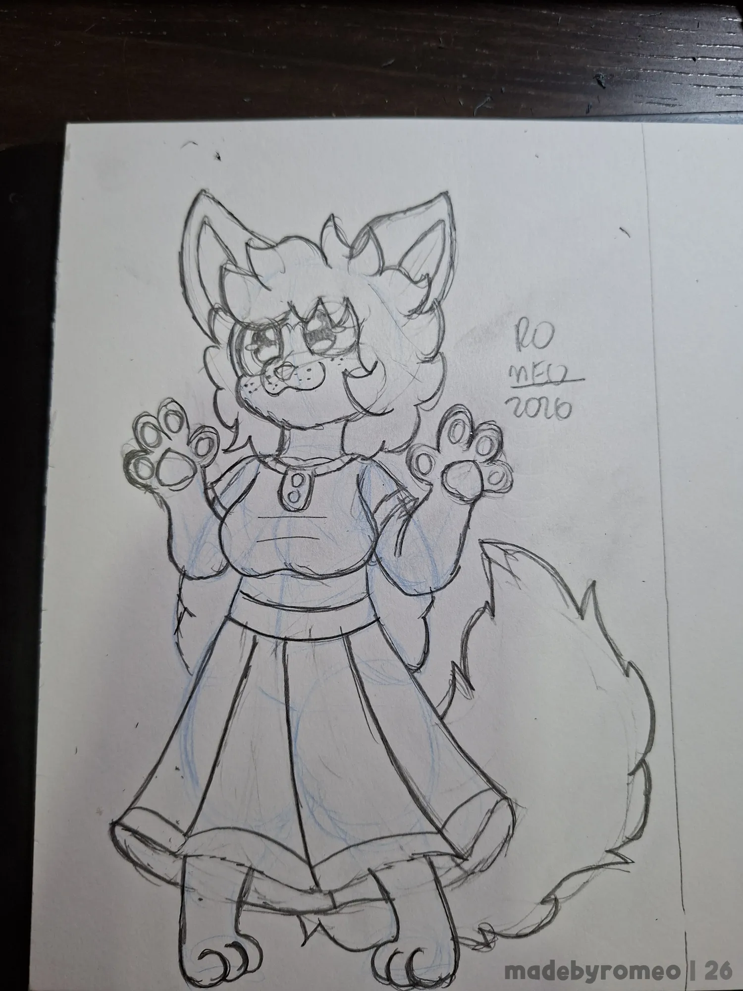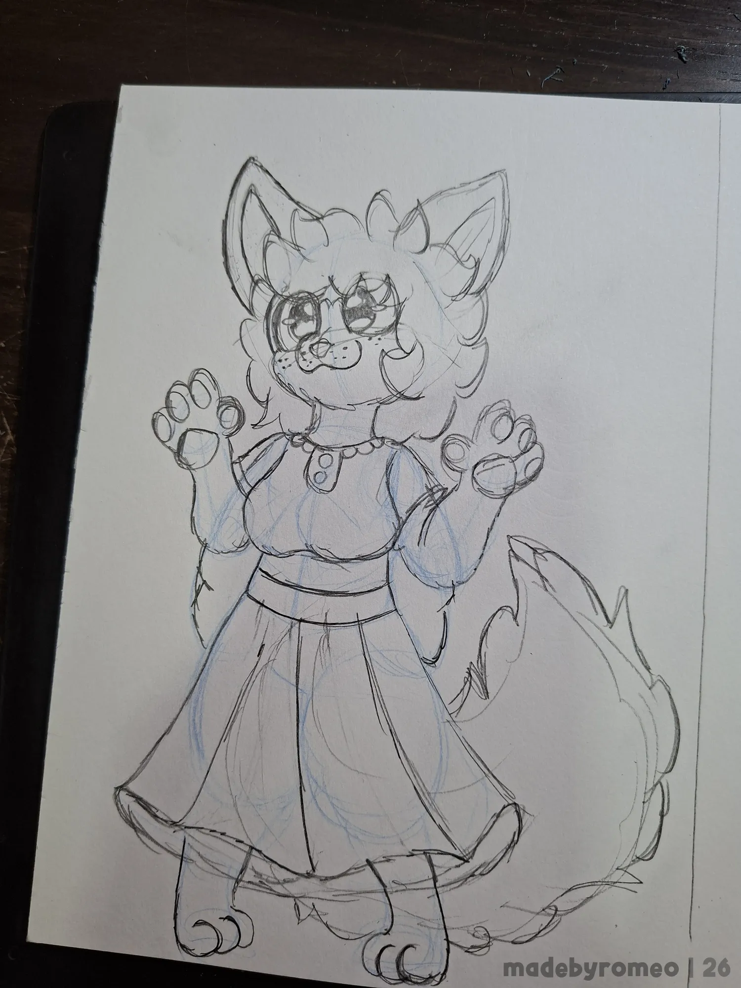 Depois avancei mais no desenho, fazendo o cabelo, cauda e mais detalhes do vestido dela, além do laço atrás do vestido. Eu gostei muito. Com isso, fiz as sardas, apaguei os traços em excesso e reforcei os principais, corrigi as patas e terminei de detalhar o vestido.
