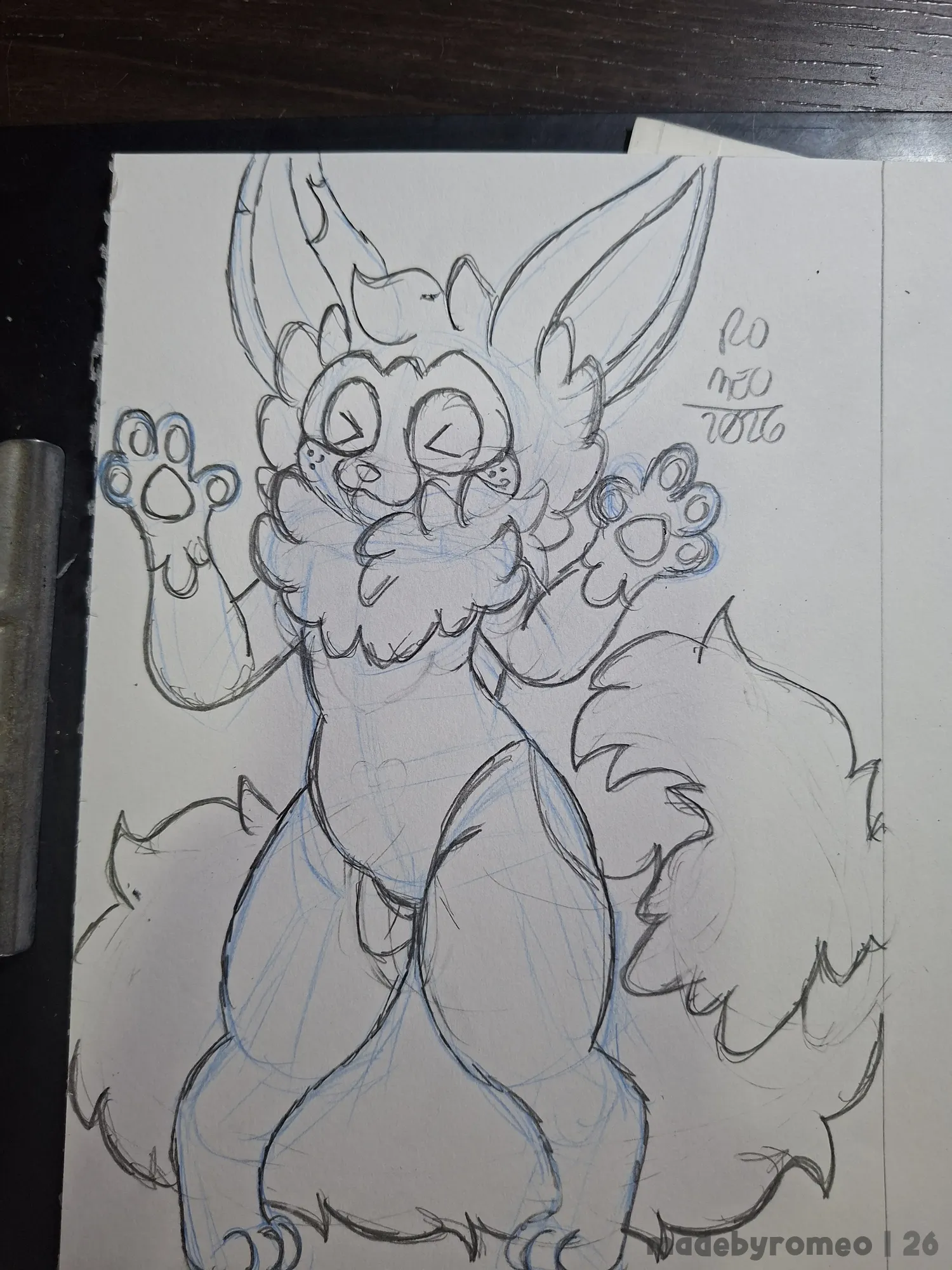 Comecei o desenho como sempre: Com as primeiras formas da pose. Com isso, fui modelar o corpo do Cannellla, fazendo o maiô, coxas, patas e olhos, além do esboço das orelhas dele. Eu estava gostando bastante de como o desenho estava ficando.