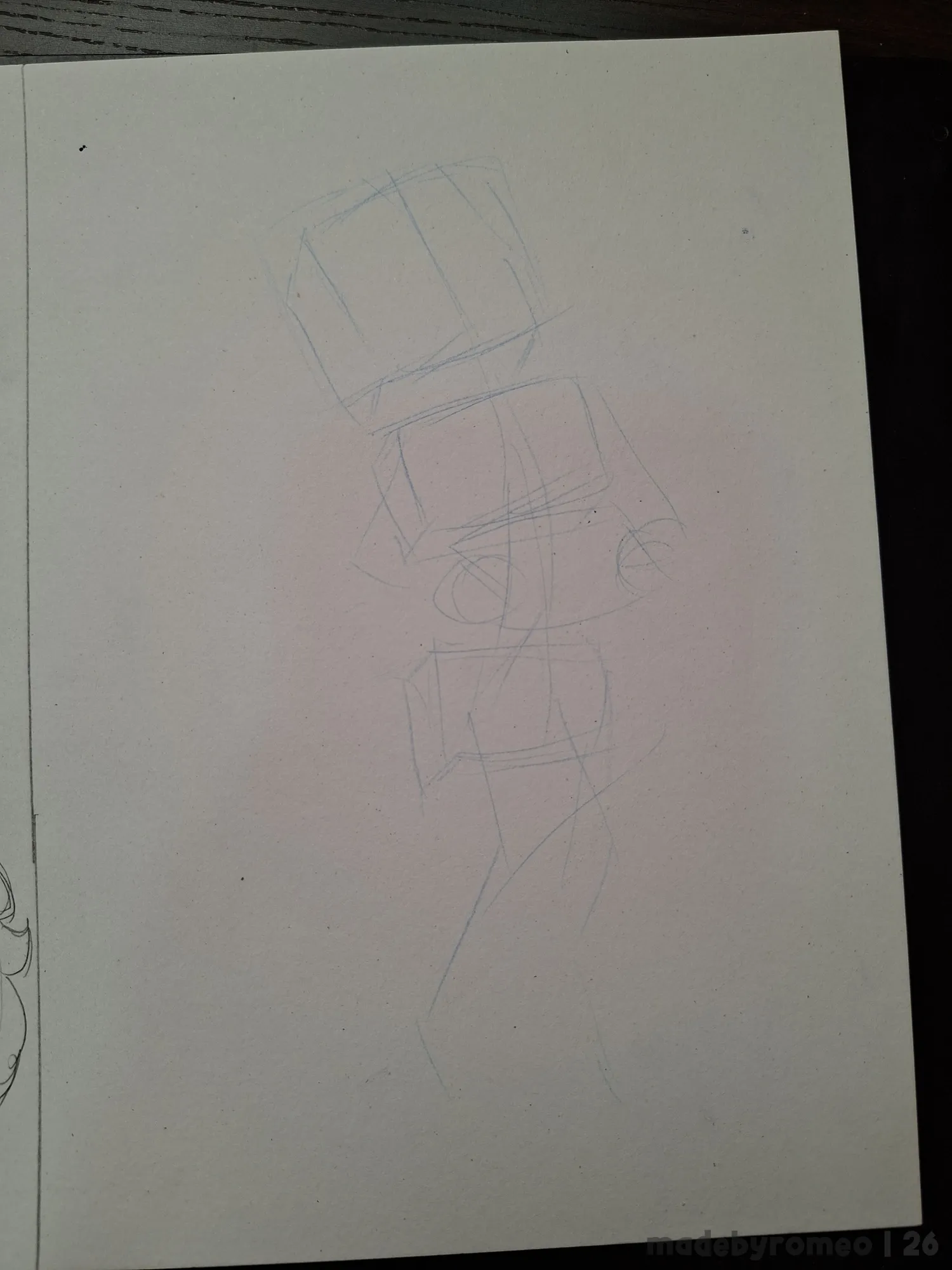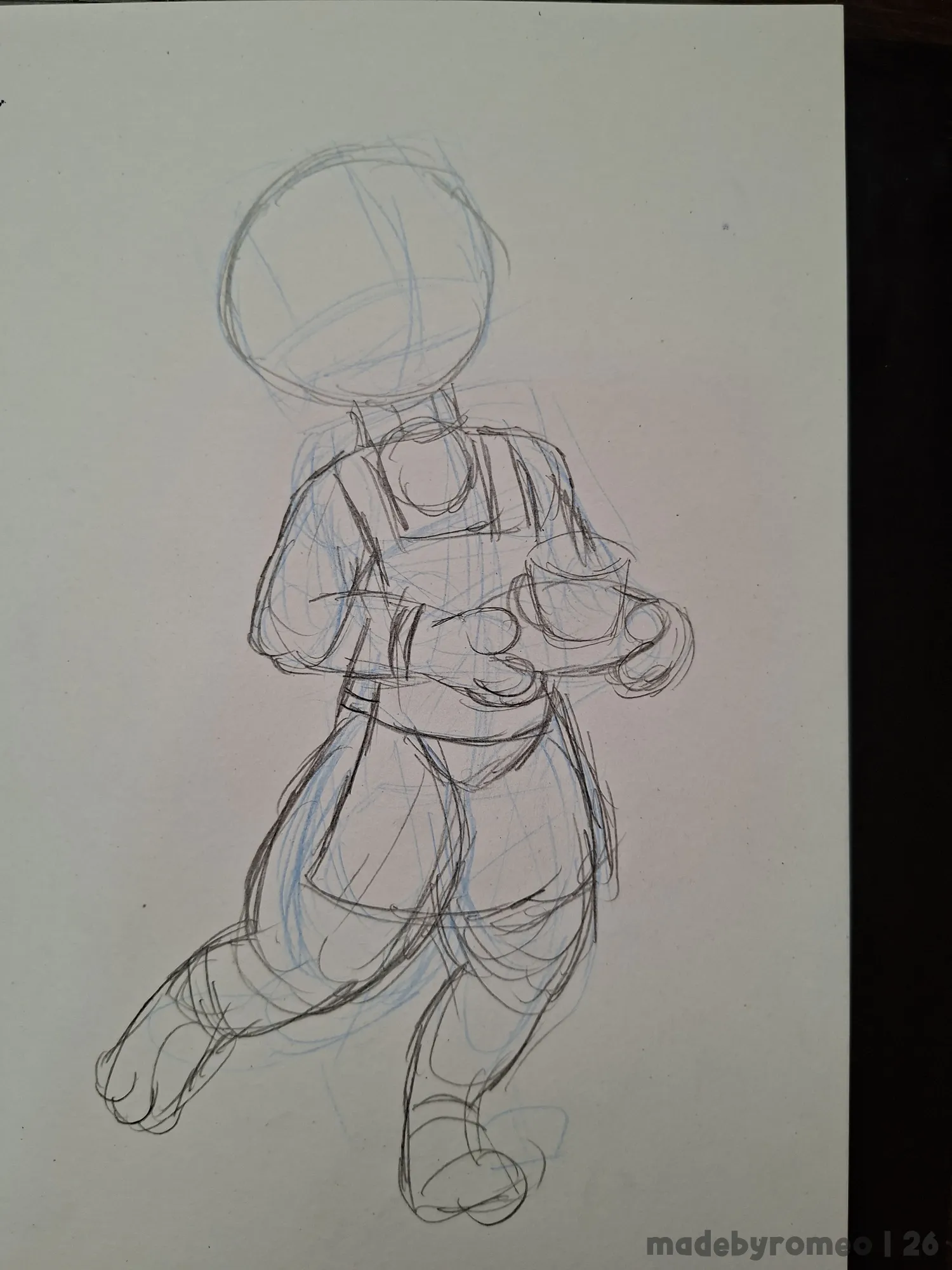 … mas resolvi me arriscar. Com o próprio grafite azul, eu me arrisquei a fazer uma pose com mais movimento, o que inicialmente não gostei, mas que decidi prosseguir, e logo ao trocar para o grafite normal e prosseguir com o esboço, comecei a gostar do que estava vendo.