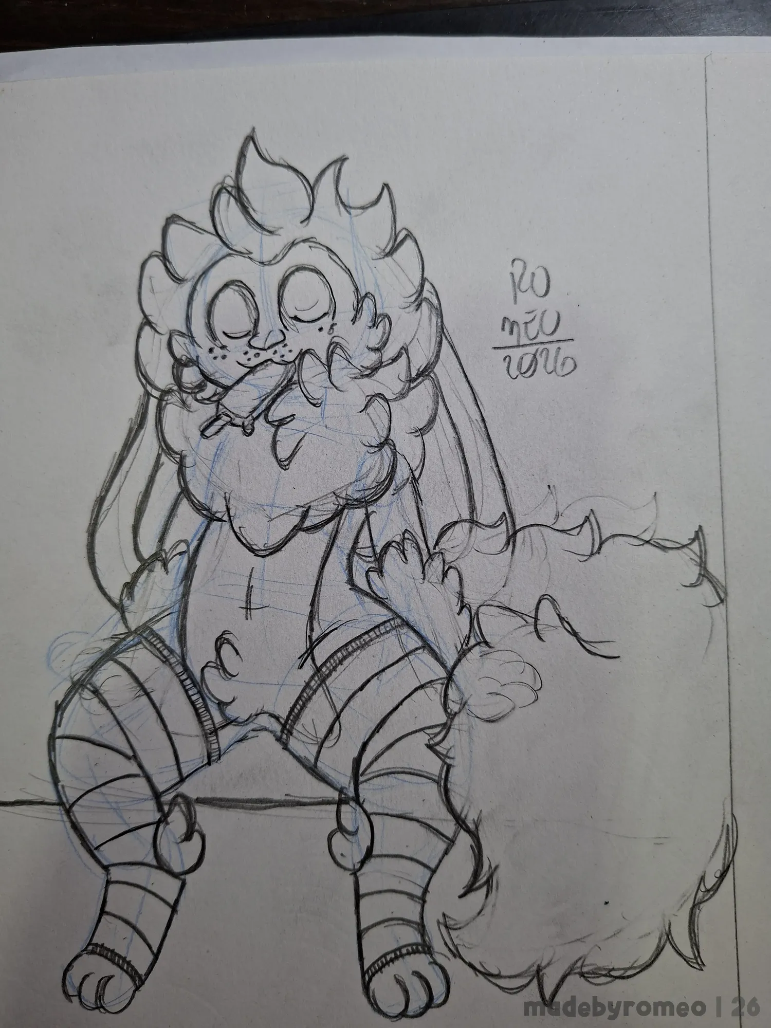 Depois, prossegui com o Romeo. fiz as orelhas, o colar de pelos, o esboço da cauda, a marca do rosto e os pelos das bochechas e da cabeça. Também tive a ideia de colocar as meias listradas do Romeo, e para mim isso deixou ele ainda mais adorável. Por fim, fiz a cauda dele, o que me fez gostar ainda mais desse desenho.