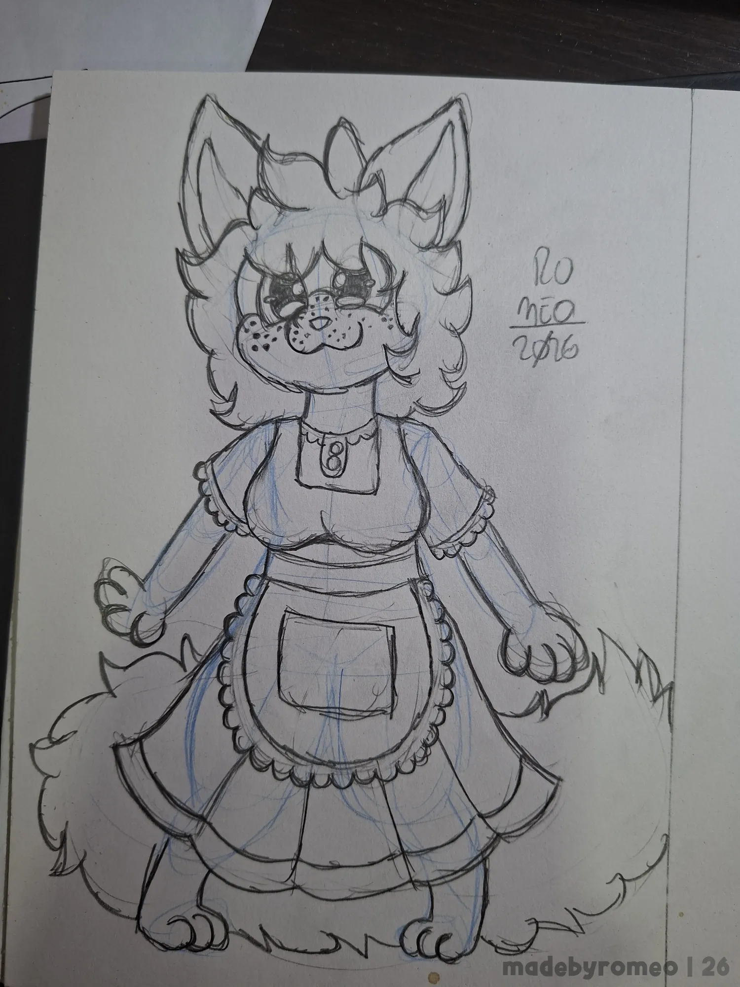 Depois, comecei a dar forma à Ruby: Fiz o cabelo, orelhas, olhos, patas e seios e comecei a fazer a roupa dela. Com isso, fui avançando no desenho, fazendo os detalhes do vestido e finalizando-o, detalhando os olhos e fazendo as sardas. Aqui, eu já estava adorando o desenho.
