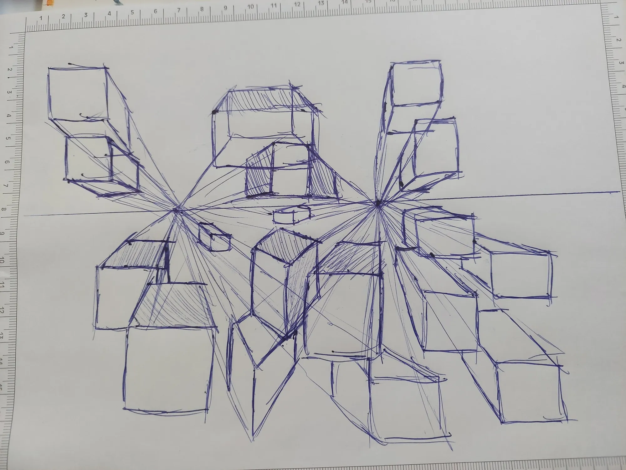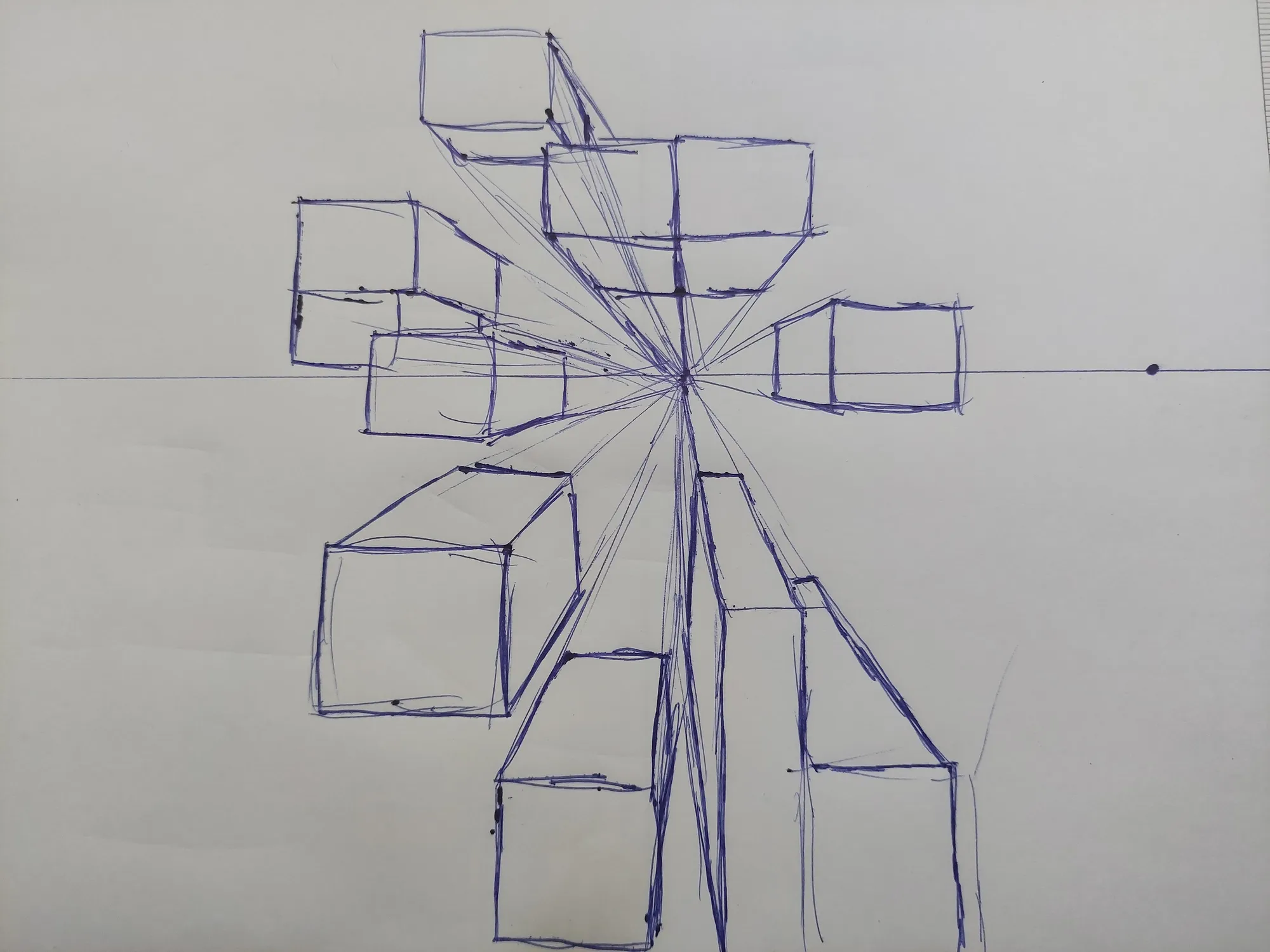 Já o terceiro, foi um com vários pontos de fuga, com cada um dos cubos tendo um ponto de fuga diferente. Acabei fazendo fazendo vários cubos.