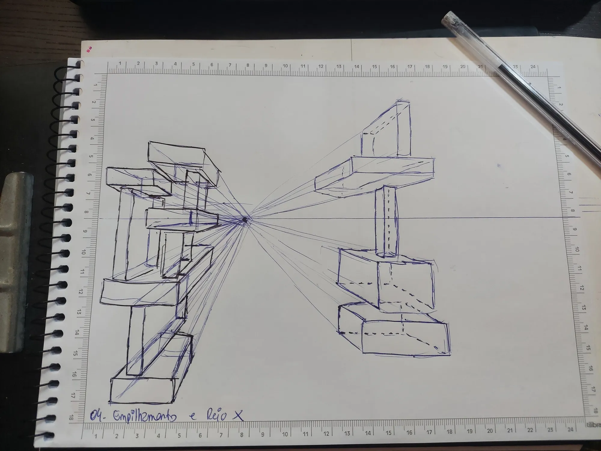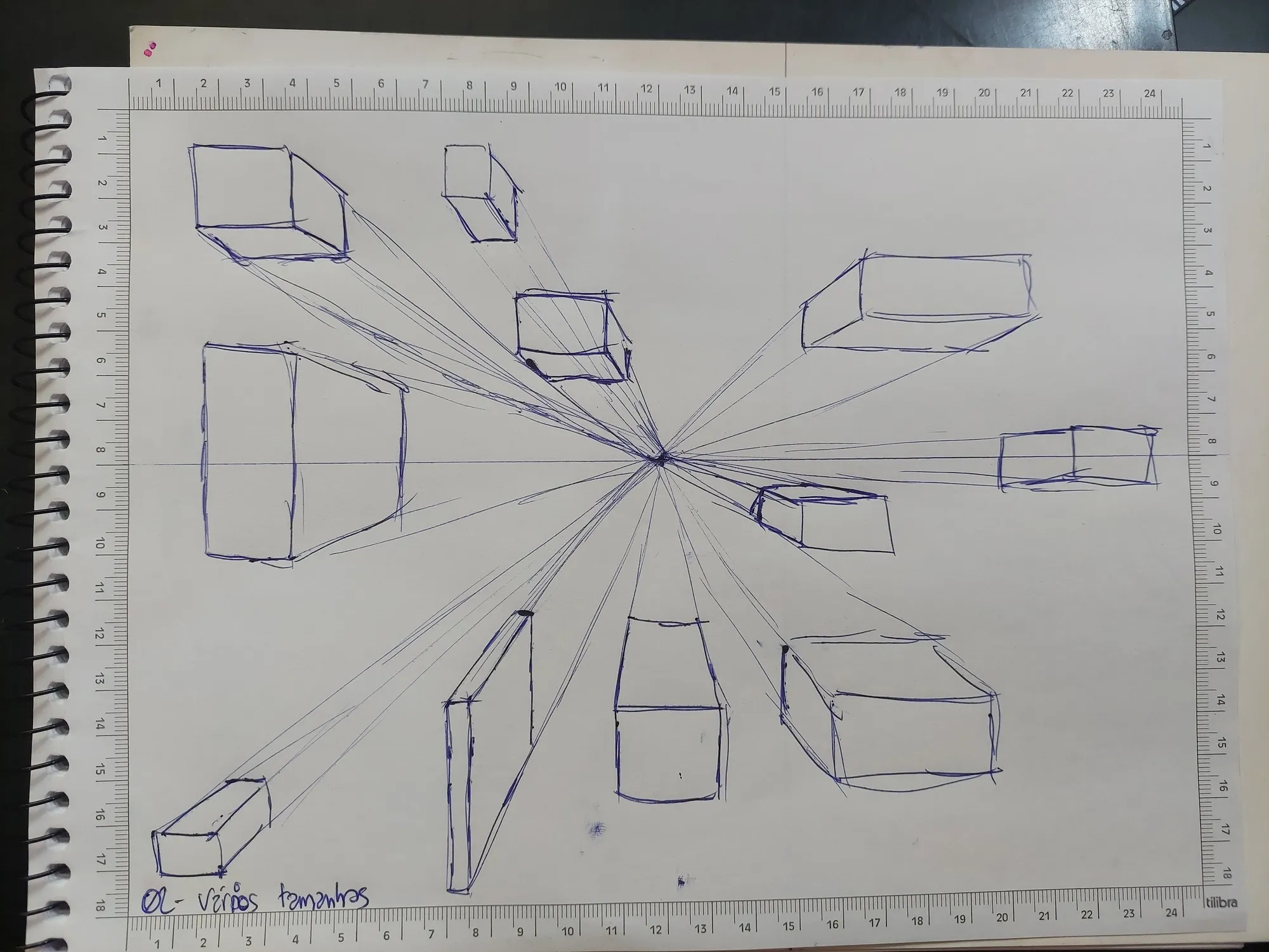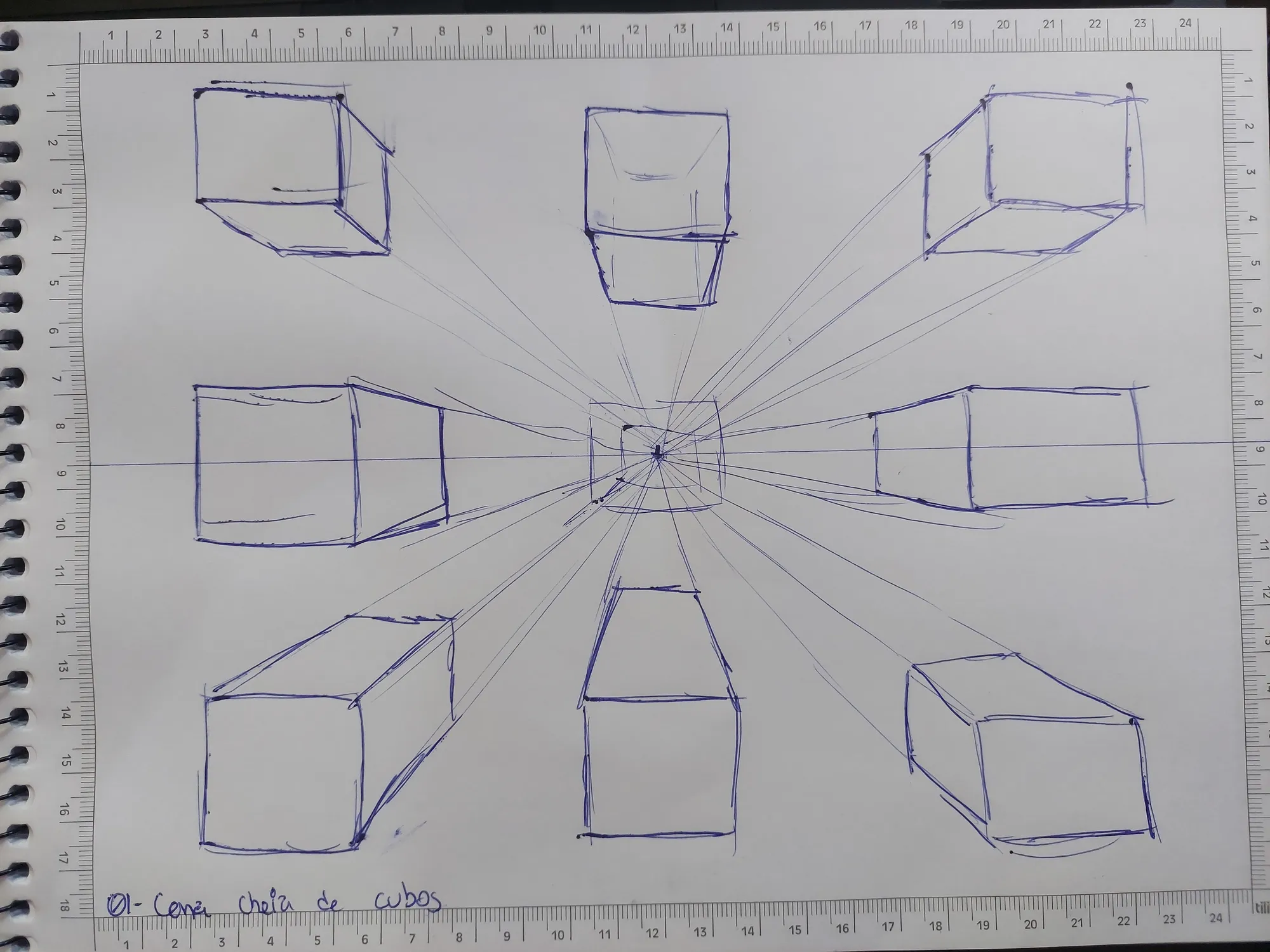 E eu gostei bastante. Com isso, li um pouco, pratiquei e fiz os cinco primeiros exercícios. O primeiro dos exercícios que fiz, foi aquele clássico dos cubos, mas a partir de um único ponto de fuga, e com cubos do mesmo tamanho.