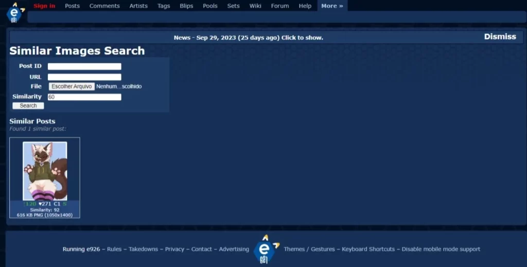 O Similar Images Search é um mecanismo de busca de artes, principalmente artes furries, que está presente tanto no e621 – que é um site bem conhecido pelos Furries -, e em sua versão SFW, o e926.